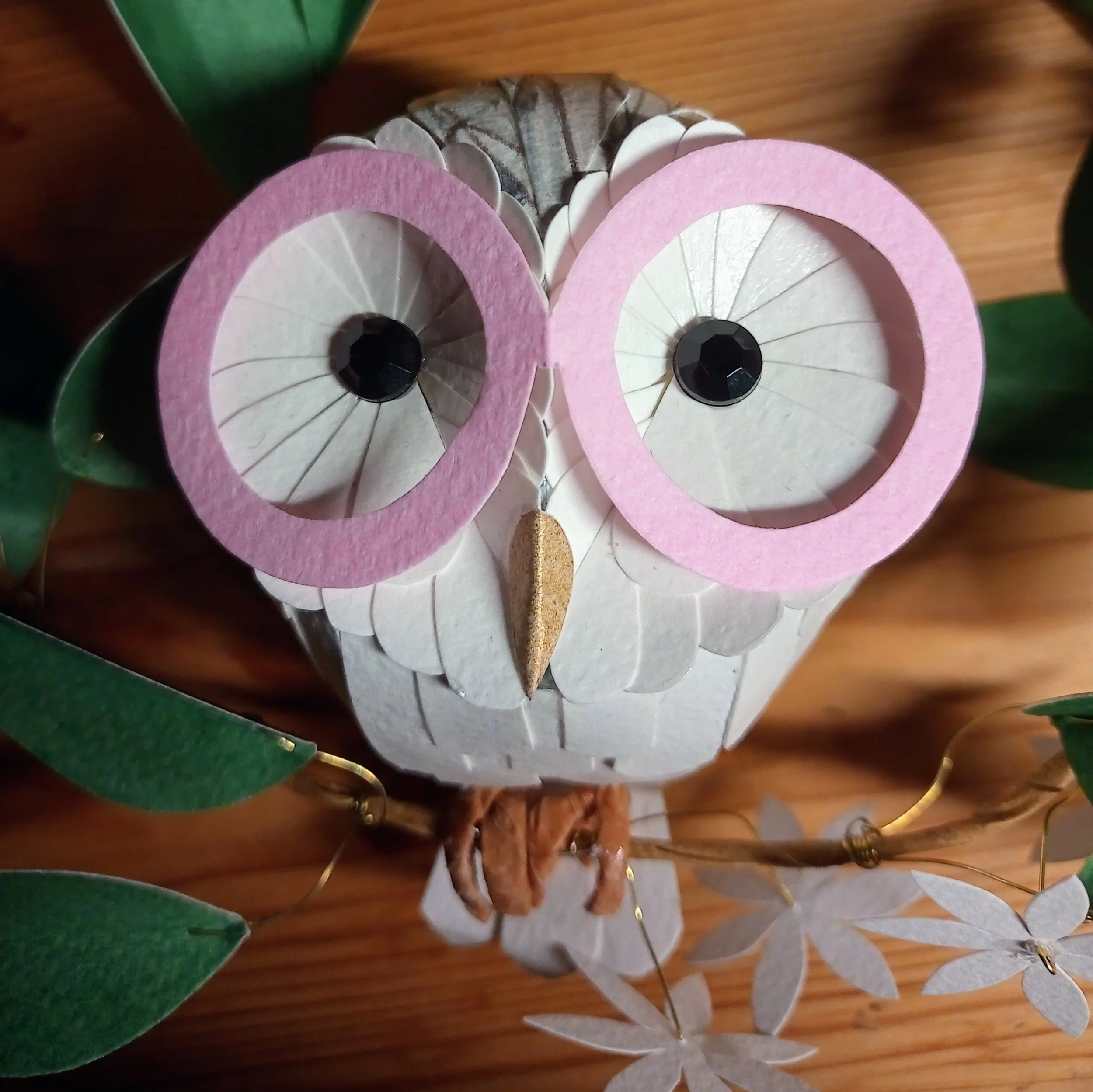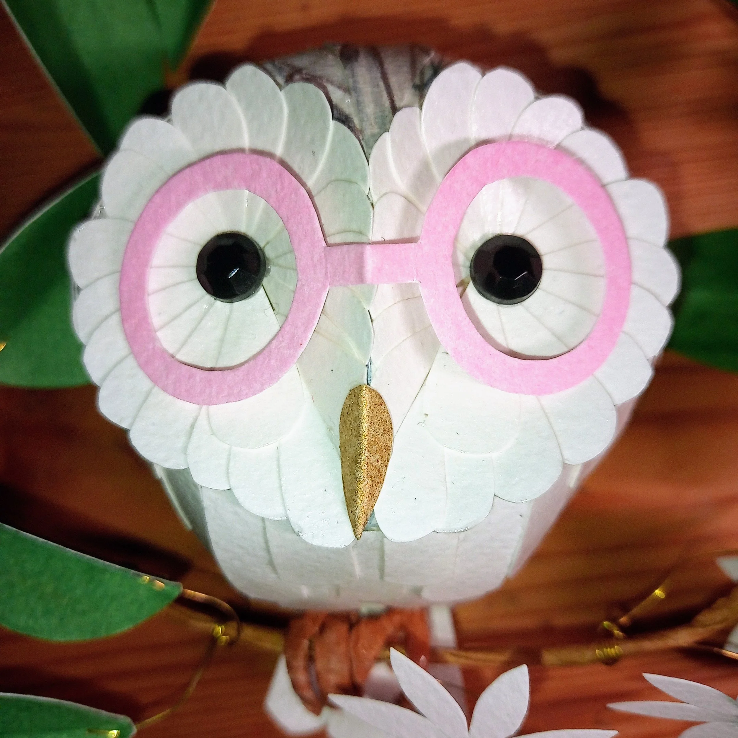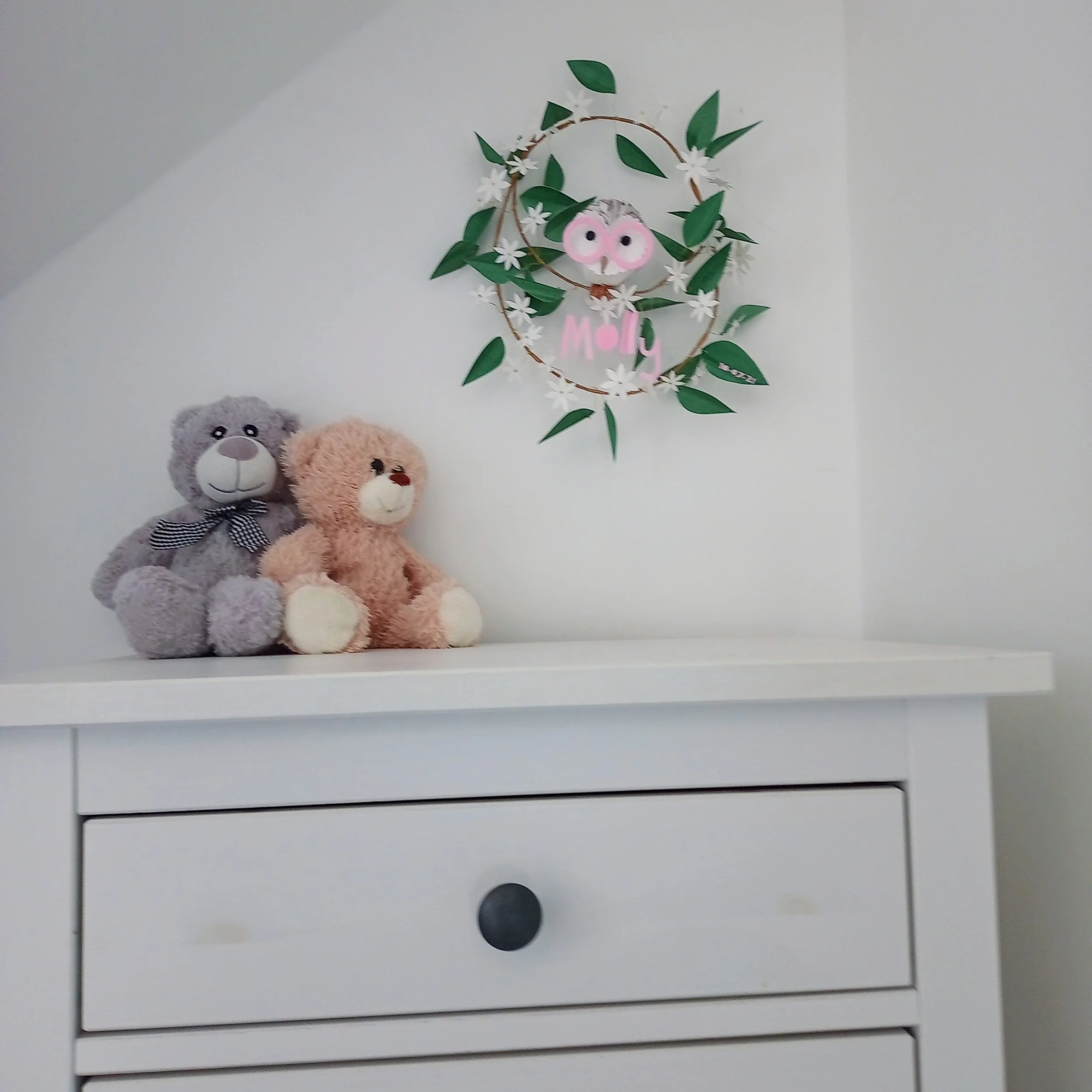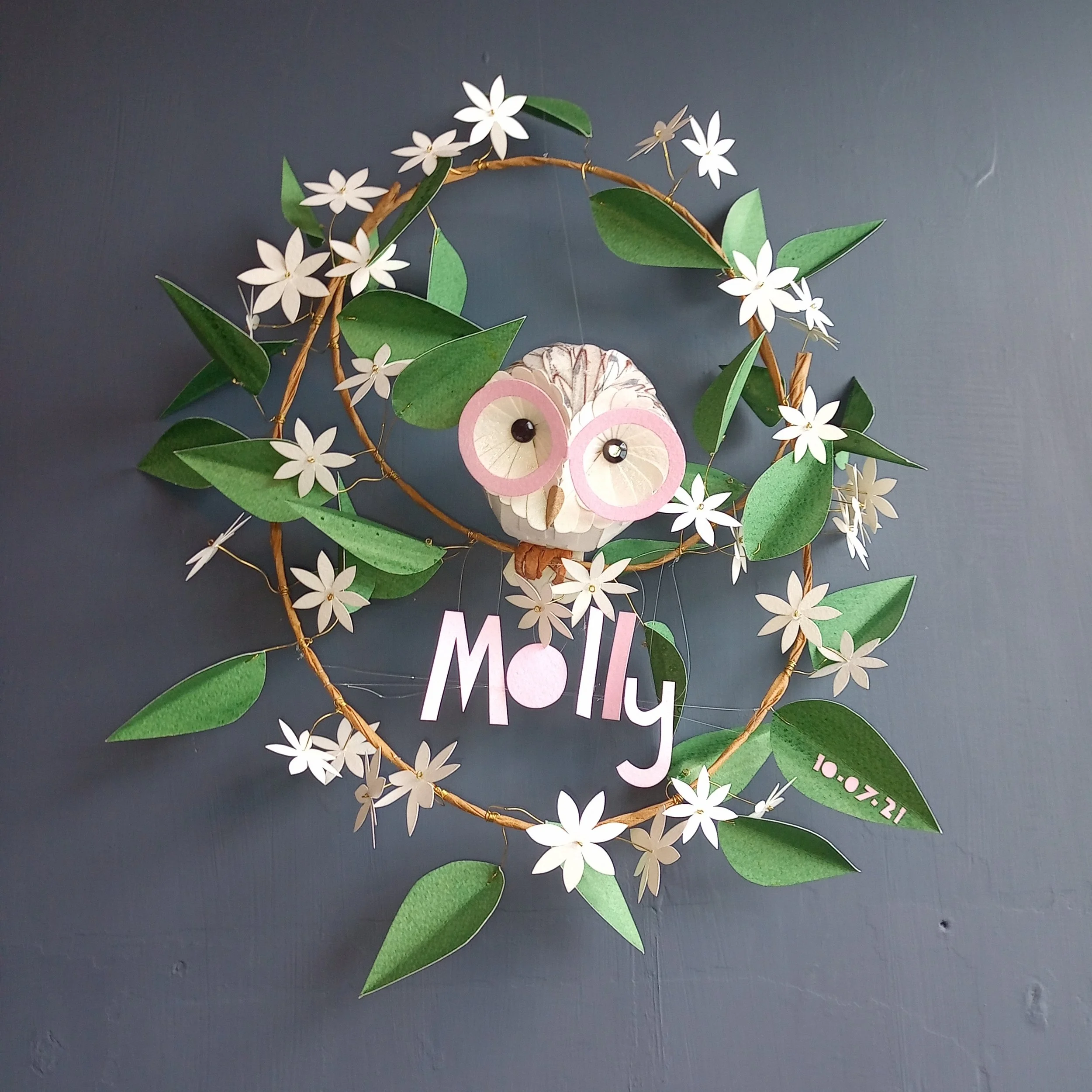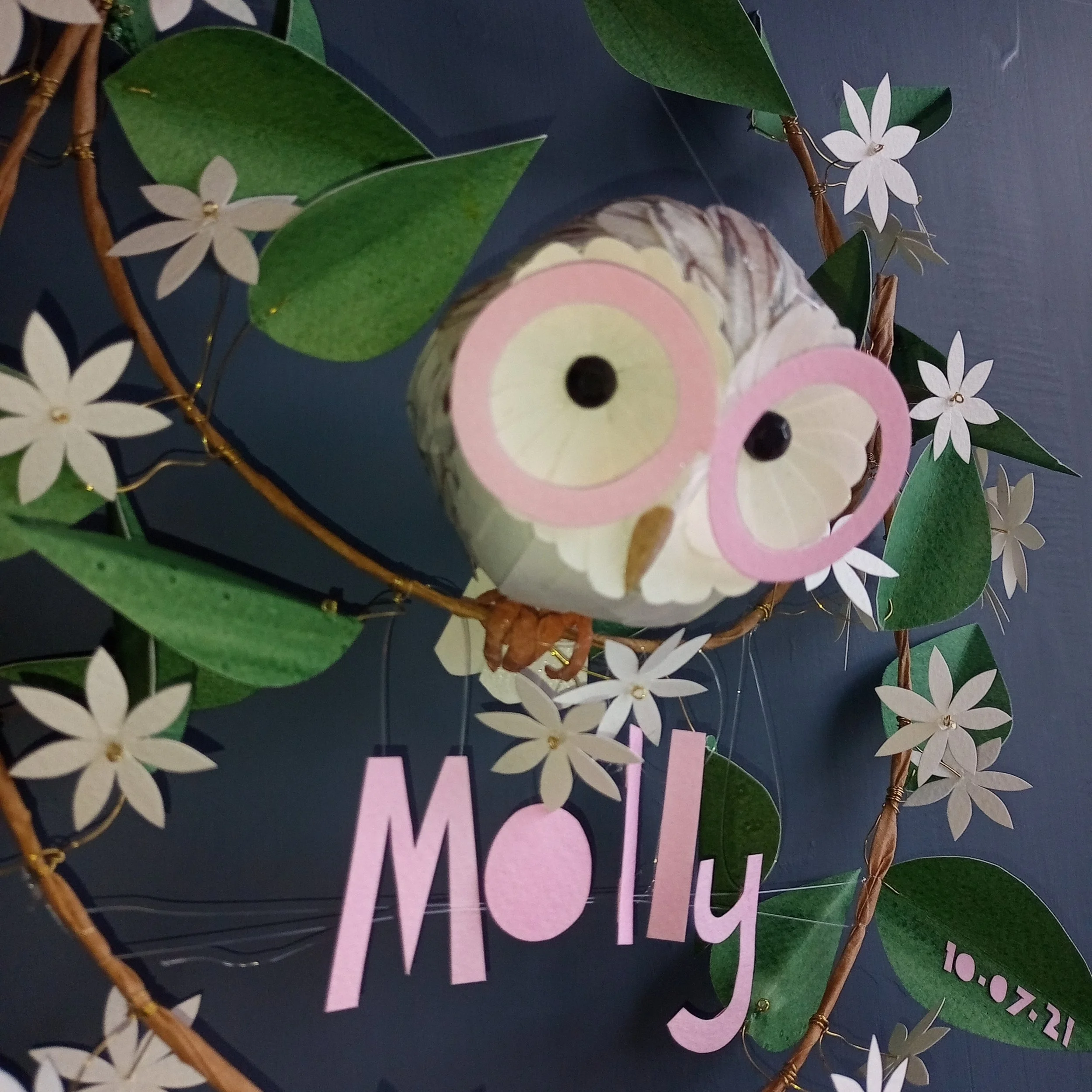 Baby Molly and her family were moving into their new family home, when Anya got in touch to commission a piece for her nursery. Attached to the email was a photograph of an adorable baby wearing round, pink glasses and Anya wanted to have an owl made wearing the same spectacles to match her daughter.