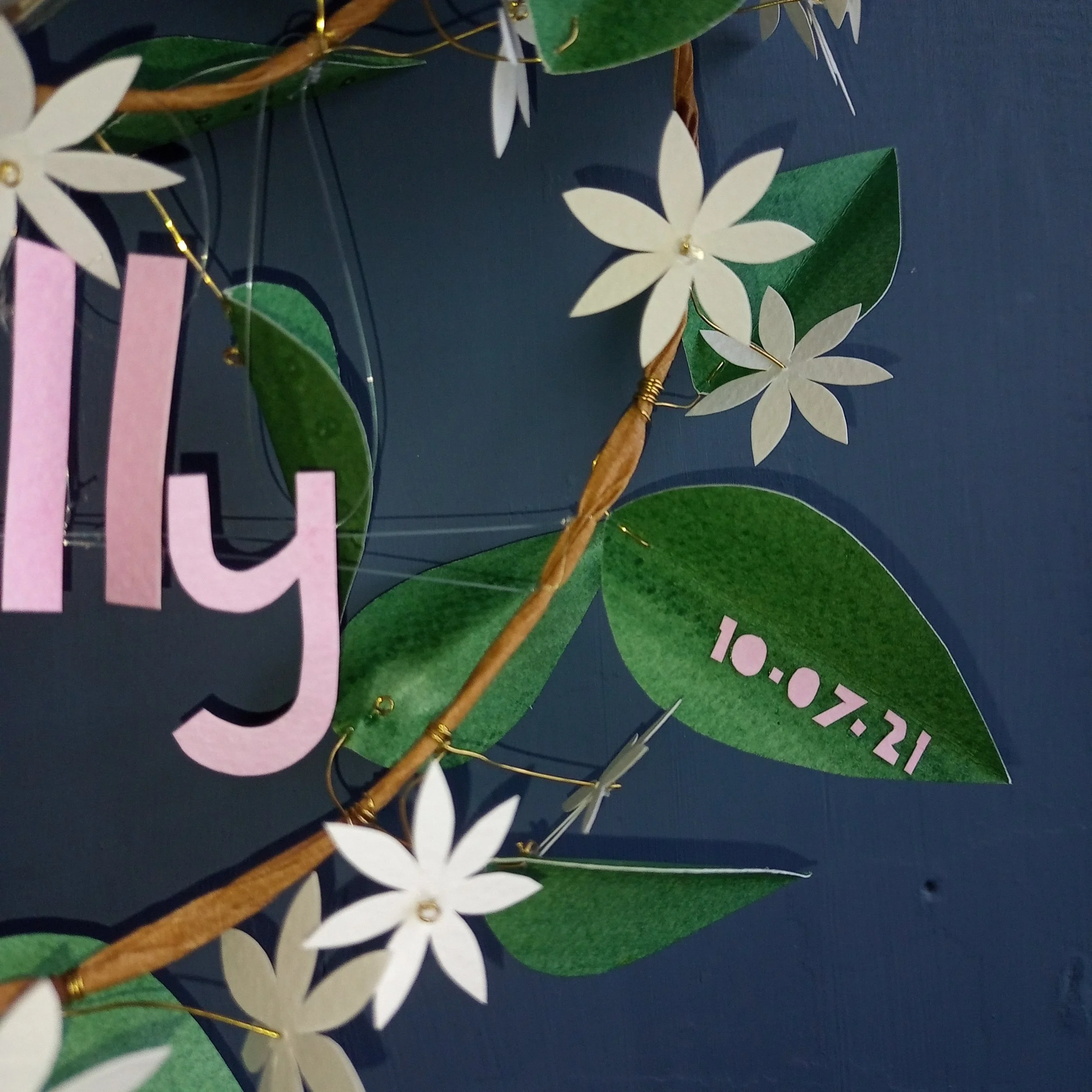Molly’s dad, David, wanted ‘Molly’ to be cut out letters, hanging inside the wreath. He also thought it would be a nice idea to include Molly’s date of birth into the design. I suggested it could be collaged onto a leaf, and David asked for the numbers to be in the same soft pink of her glasses and name.