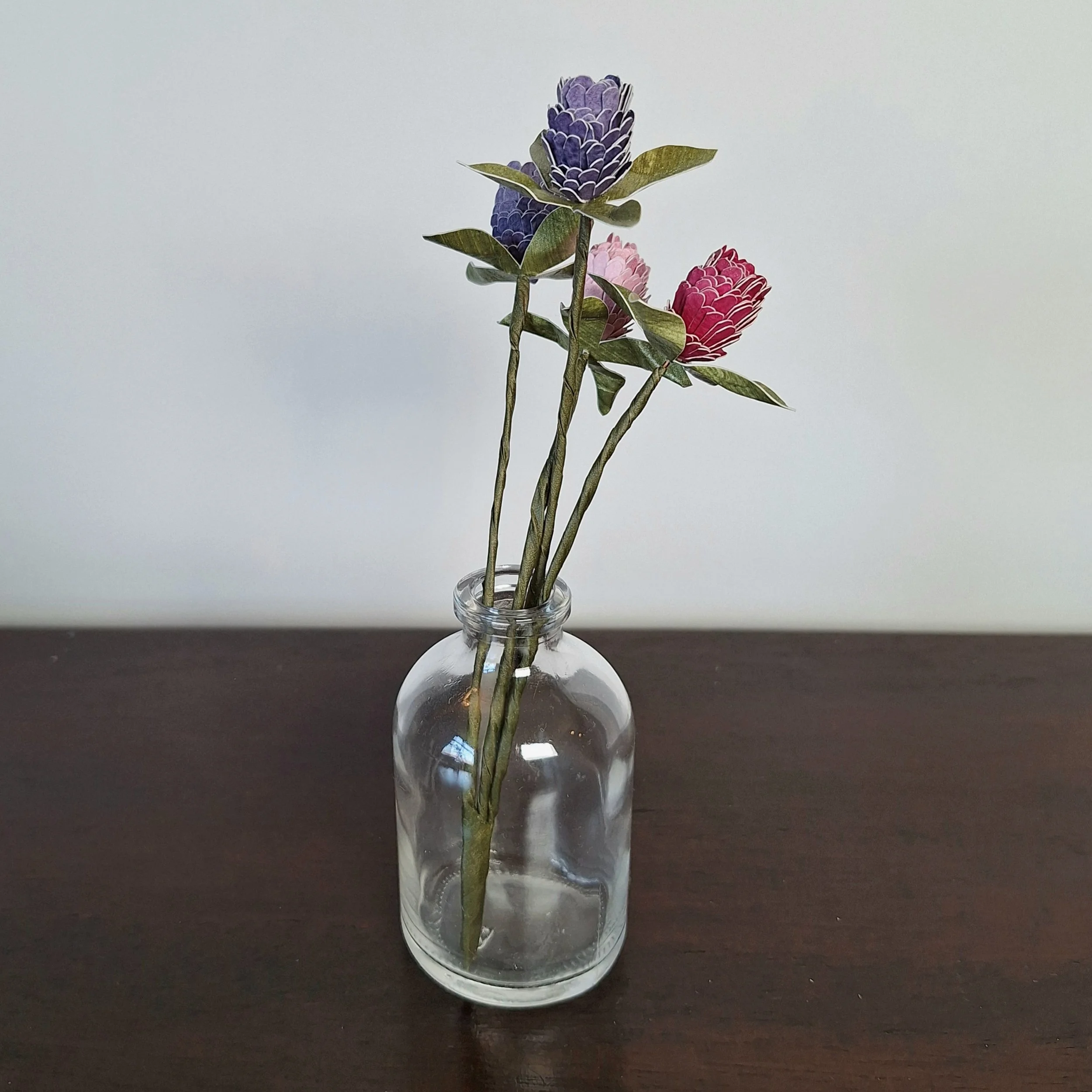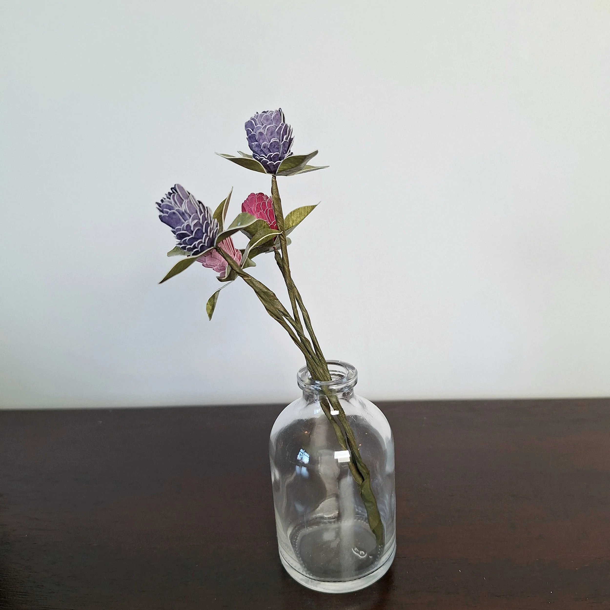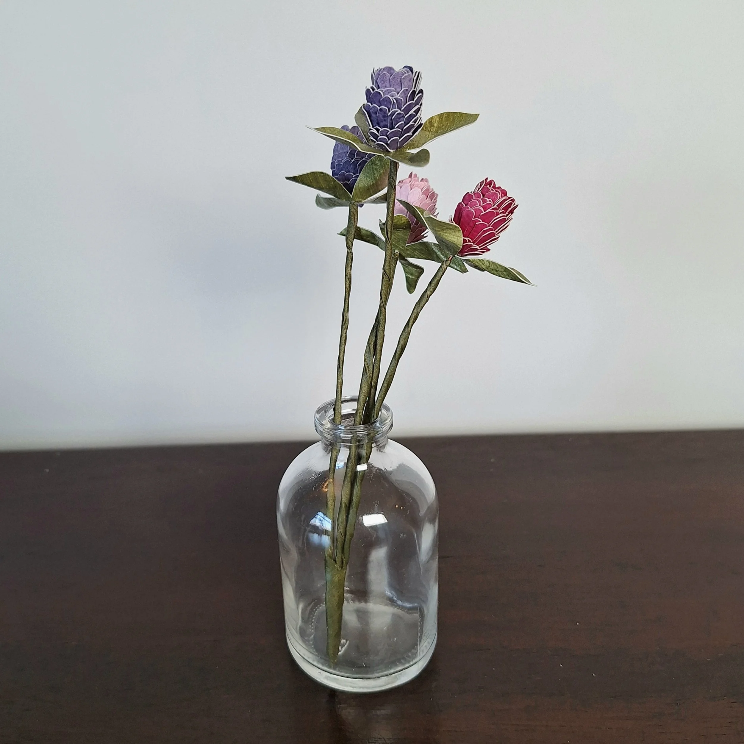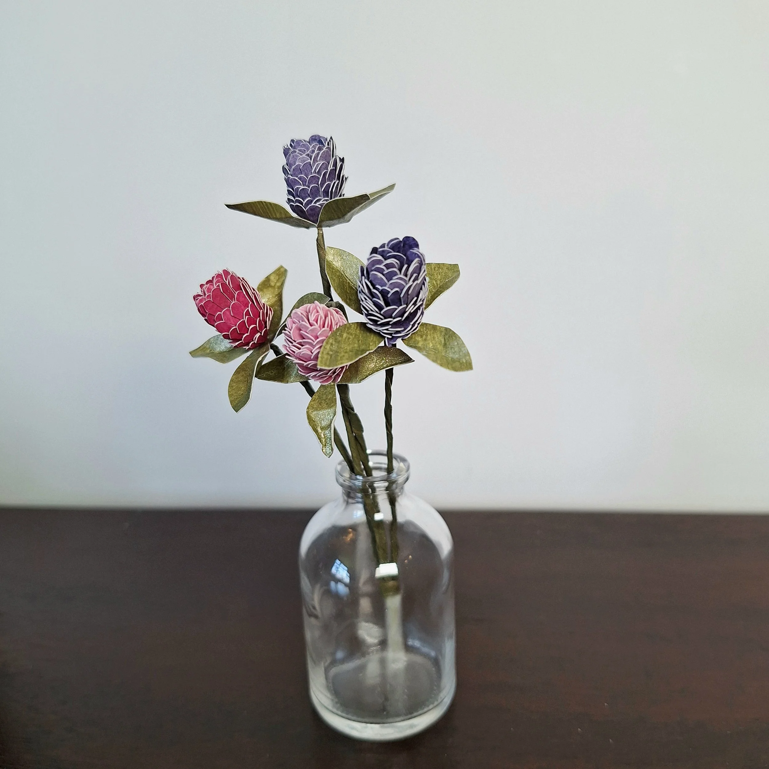 Four clover stems comprise this handmade min bouquet of paper flowers. There are two purple flowers, on baby pink and one pinkish red. They sit in a glass bottle vase.