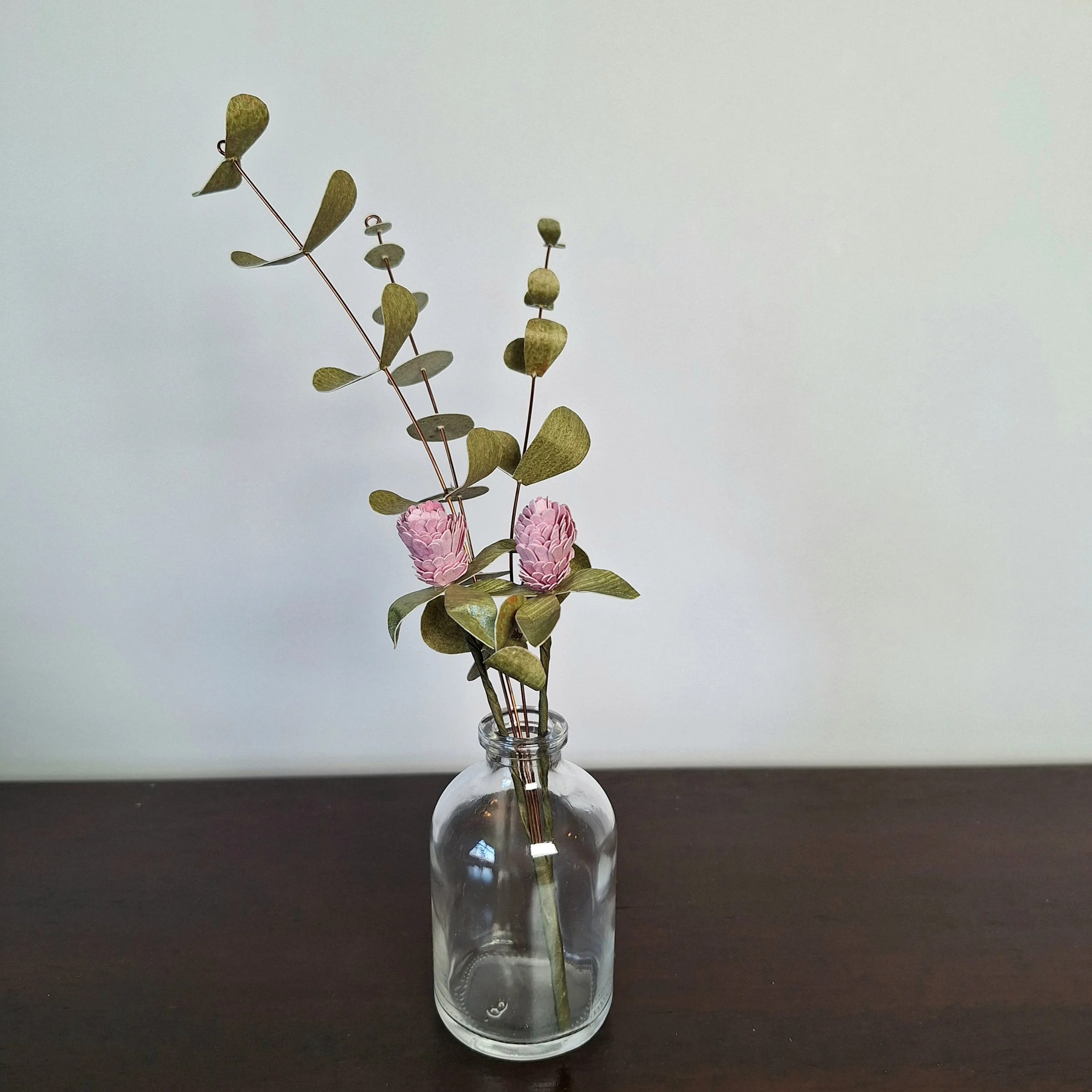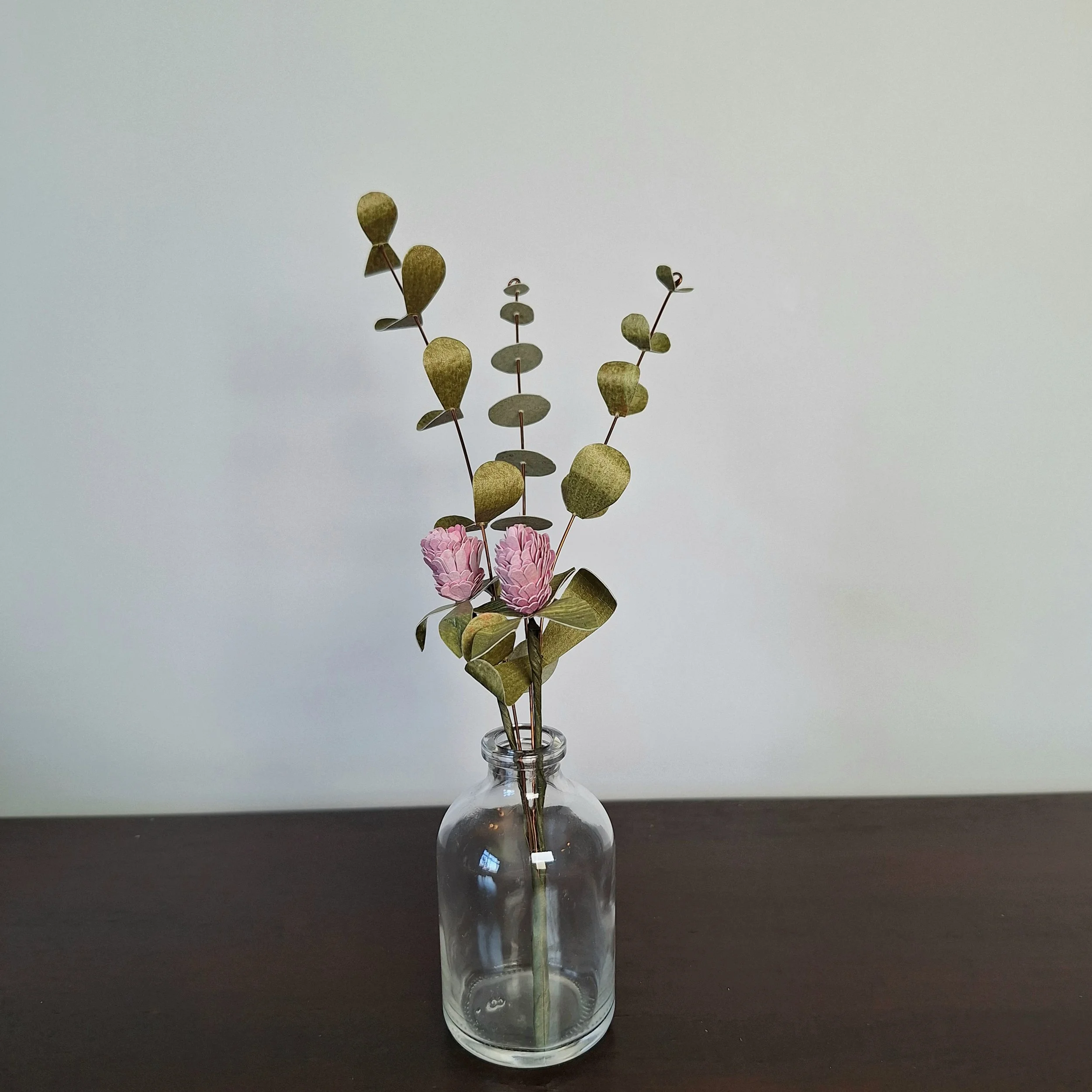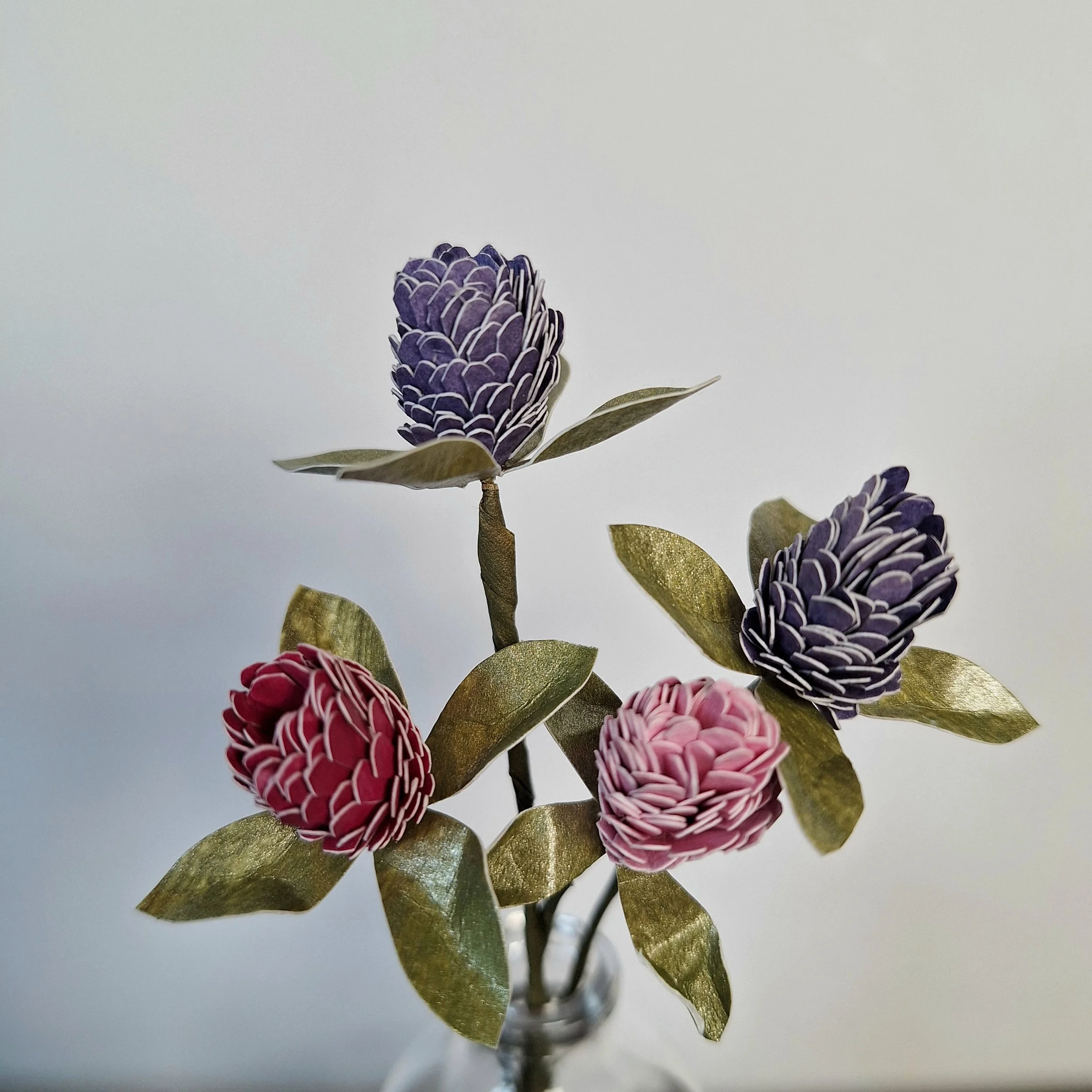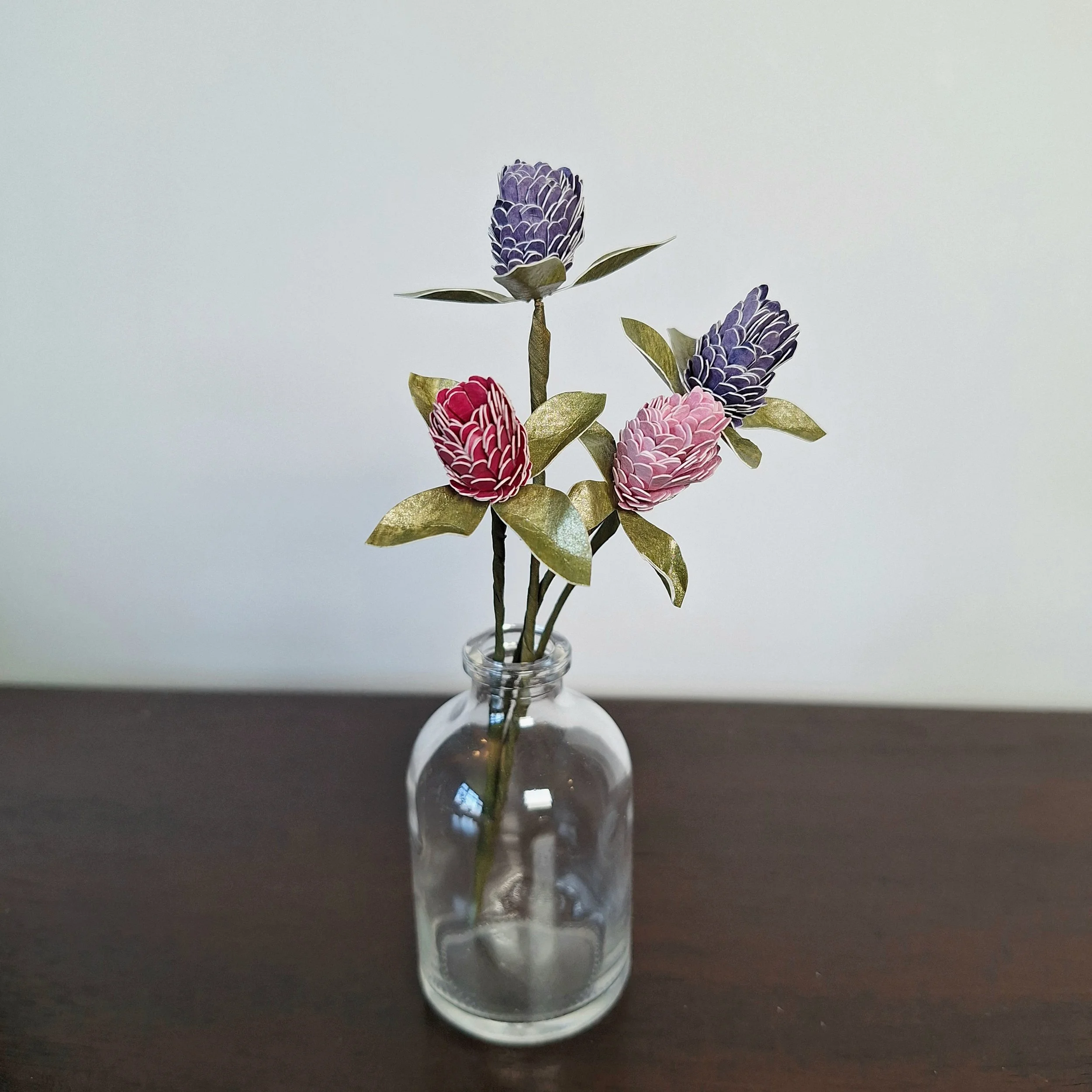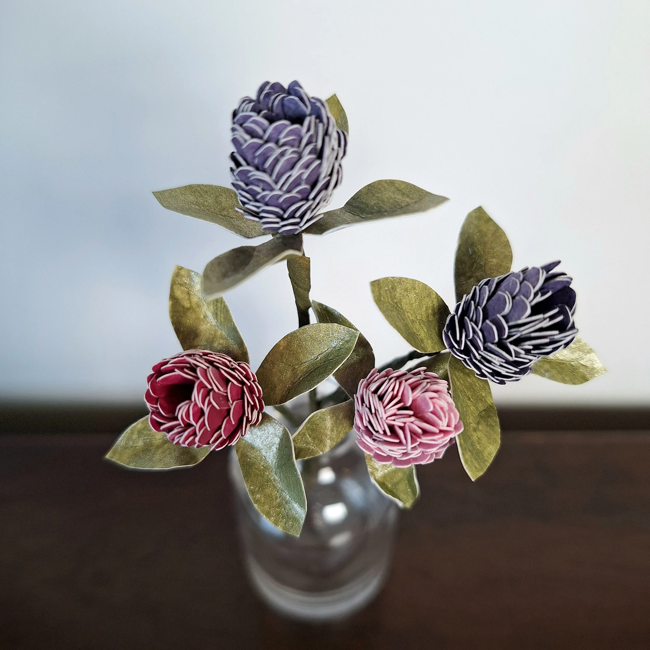 Four clover stems comprise this handmade min bouquet of paper flowers. There are two purple flowers, on baby pink and one pinkish red. They sit in a glass bottle vase.