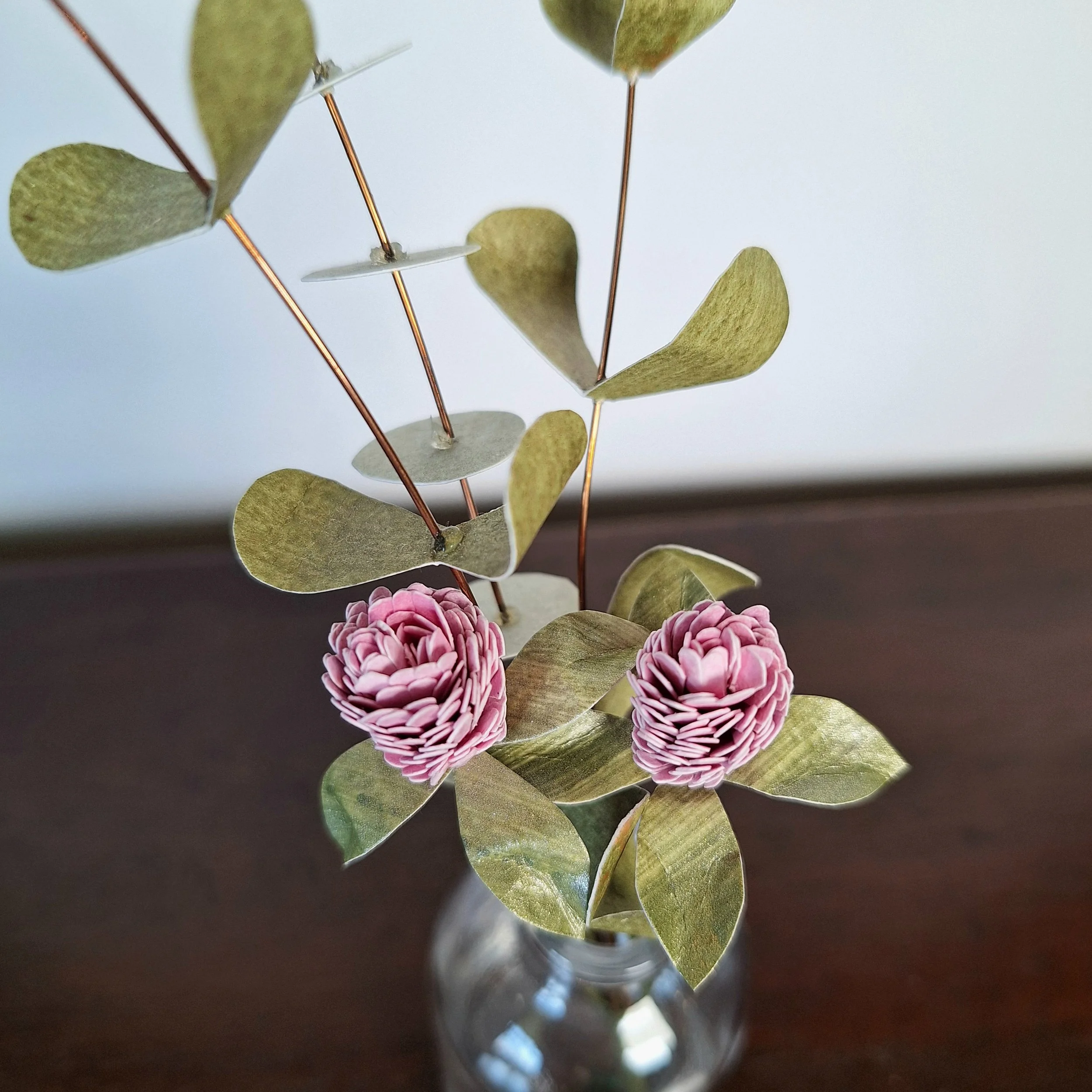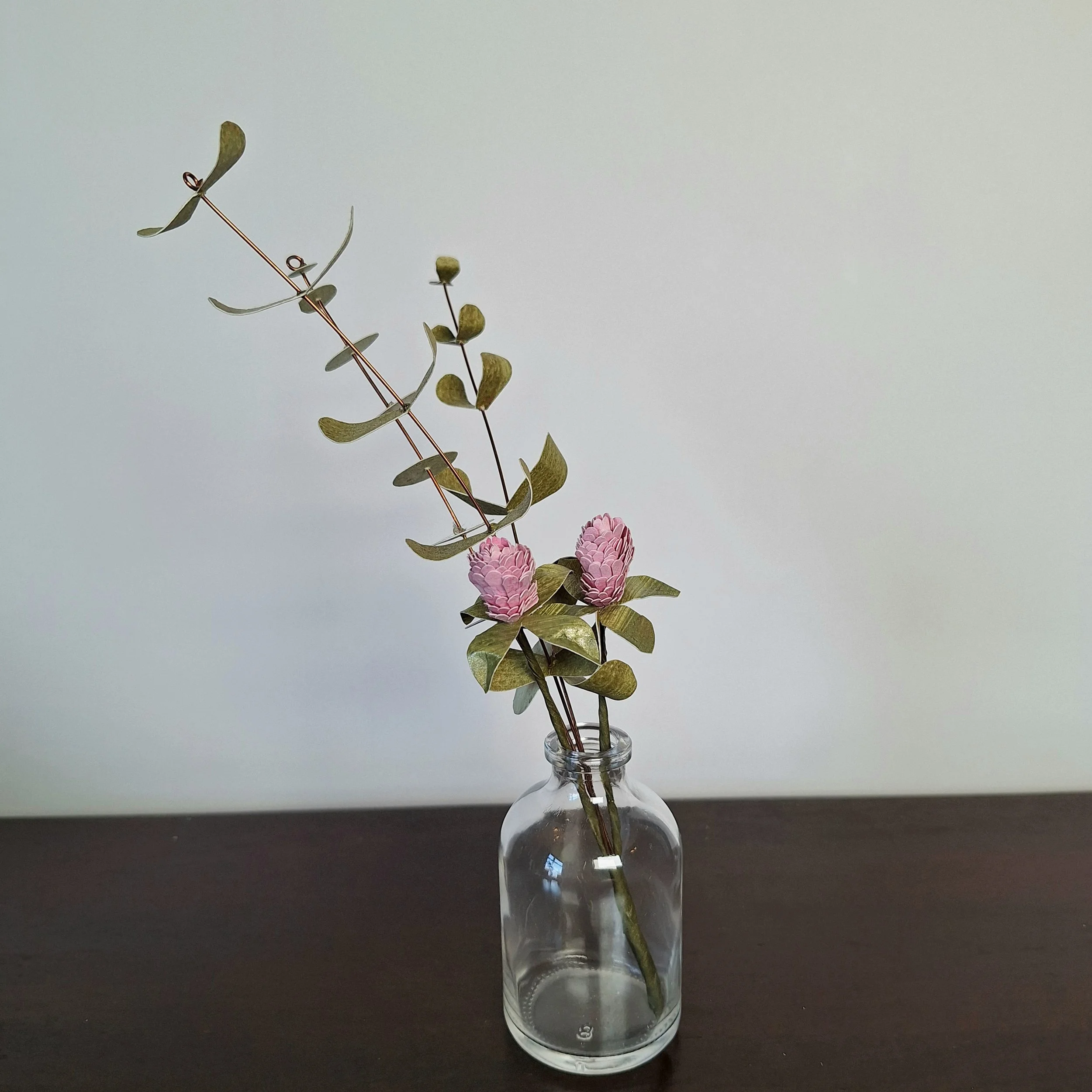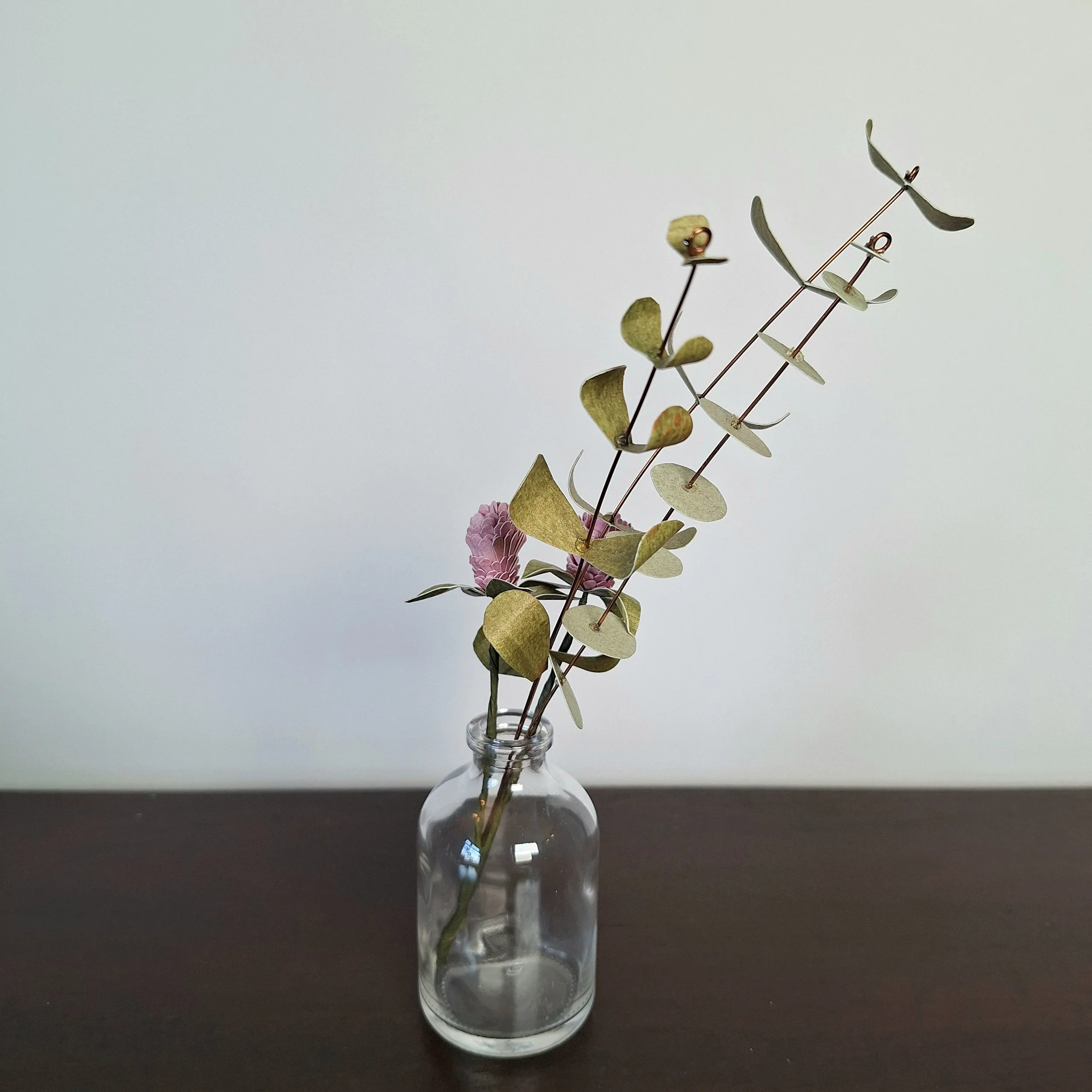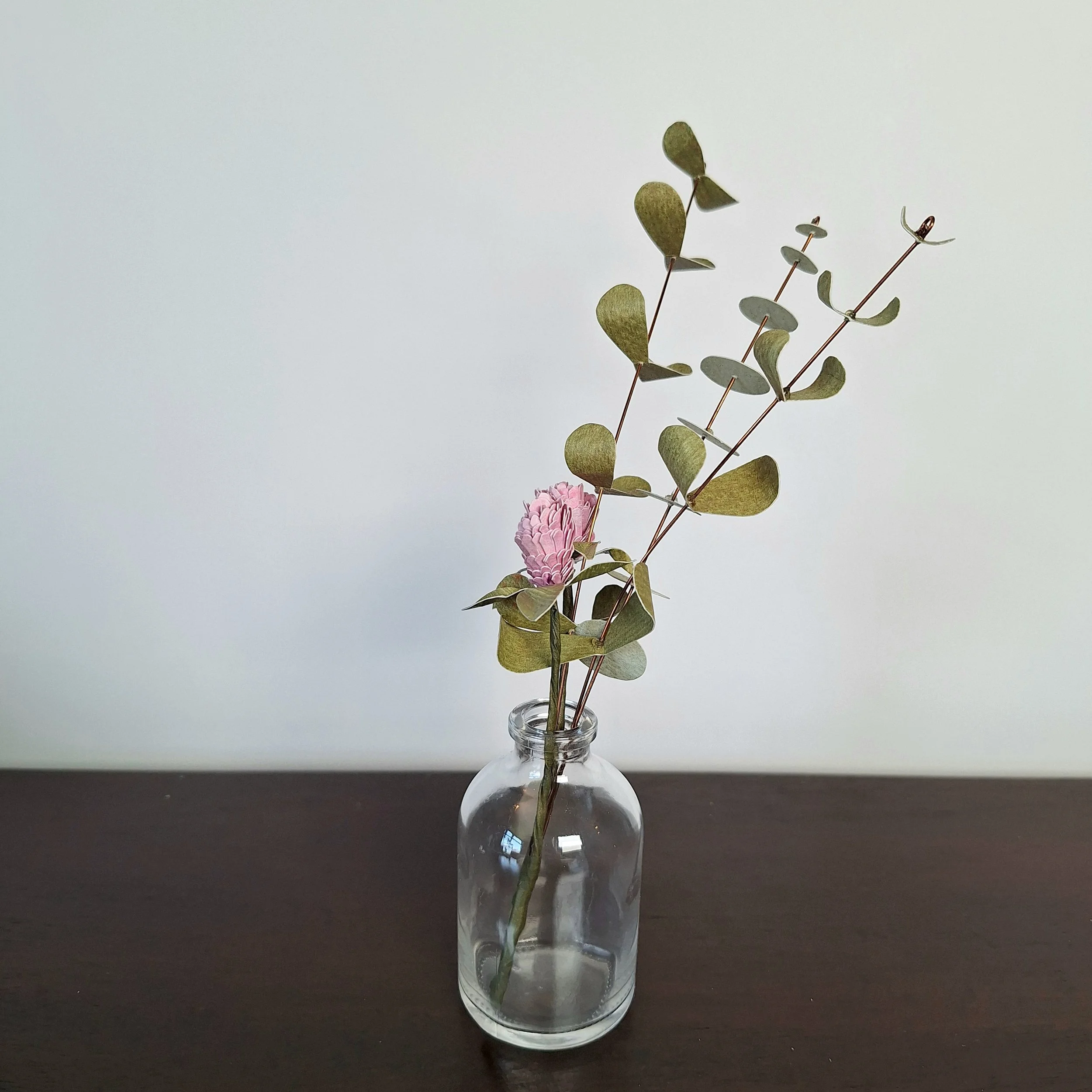 Four clover stems comprise this handmade min bouquet of paper flowers. There are two purple flowers, on baby pink and one pinkish red. They sit in a glass bottle vase.