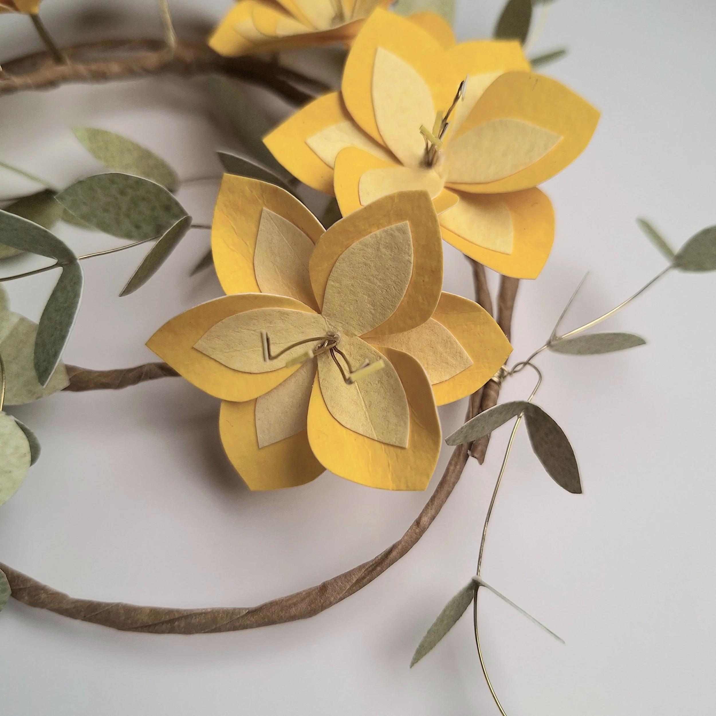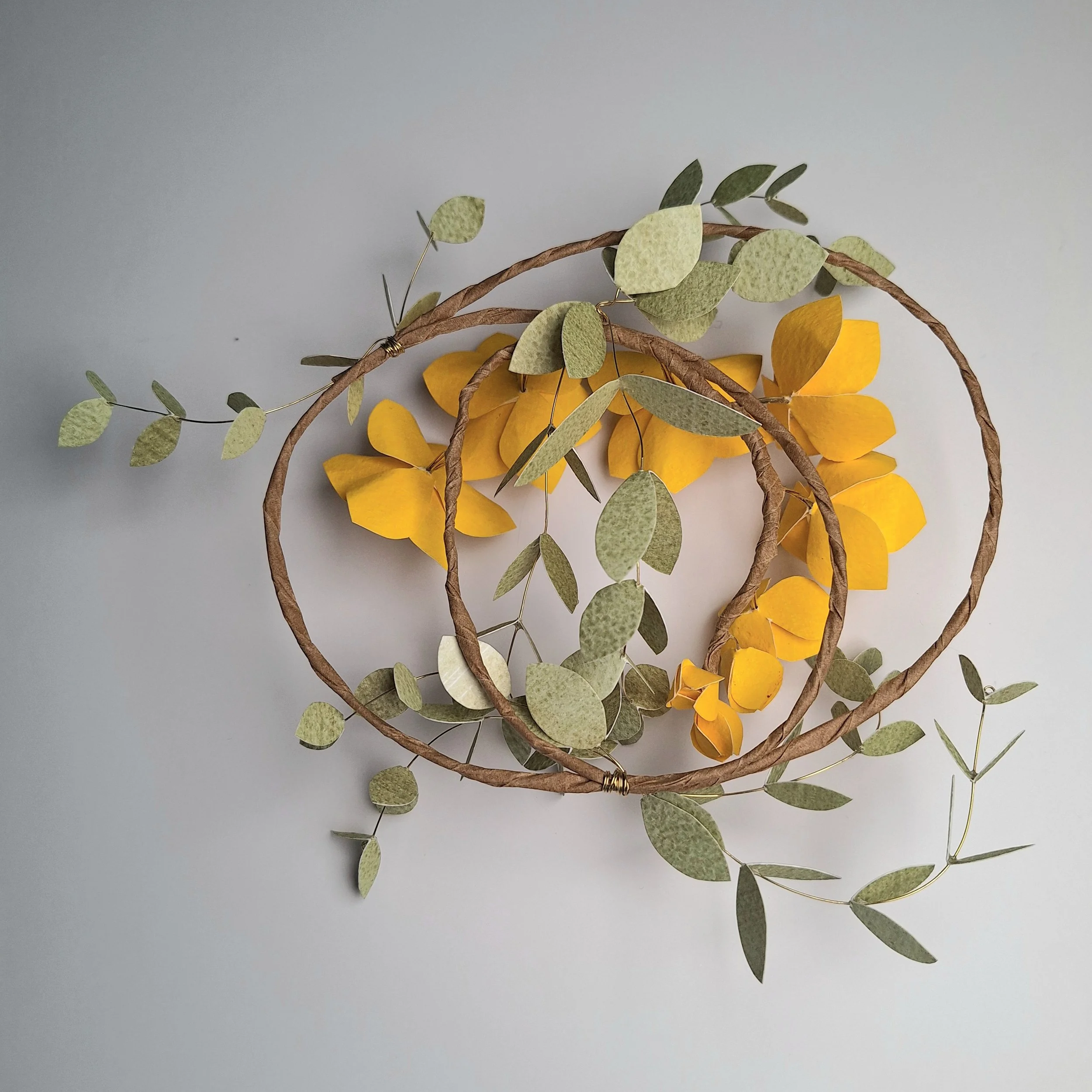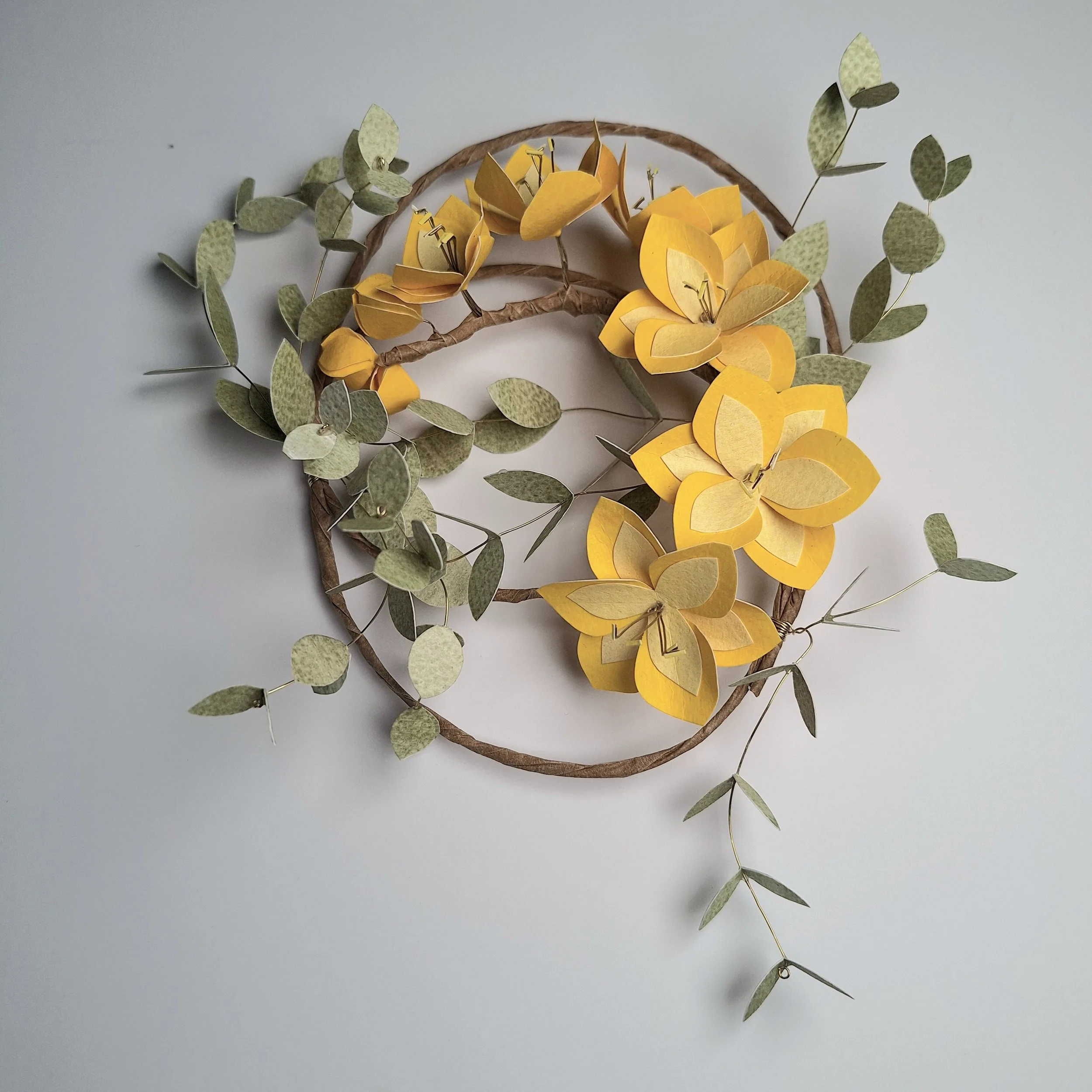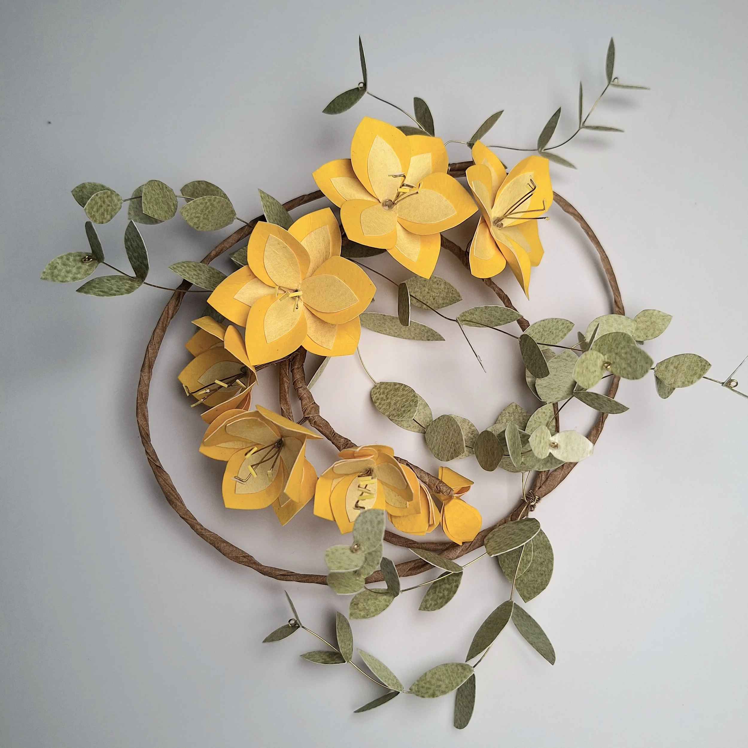 This wreath features a stem of sunshine yellow freesia blooms, ascending in size from bud to fully open flowers.