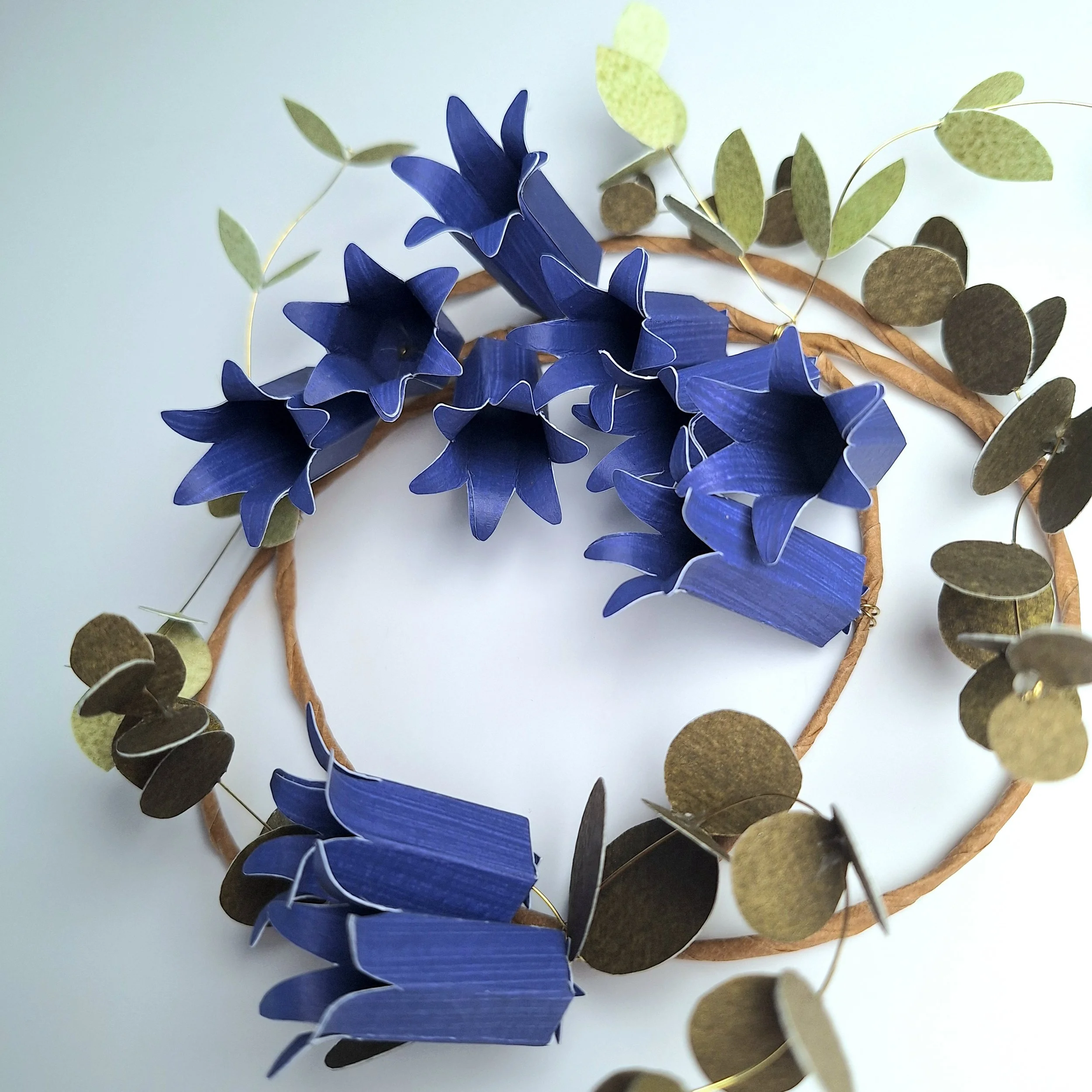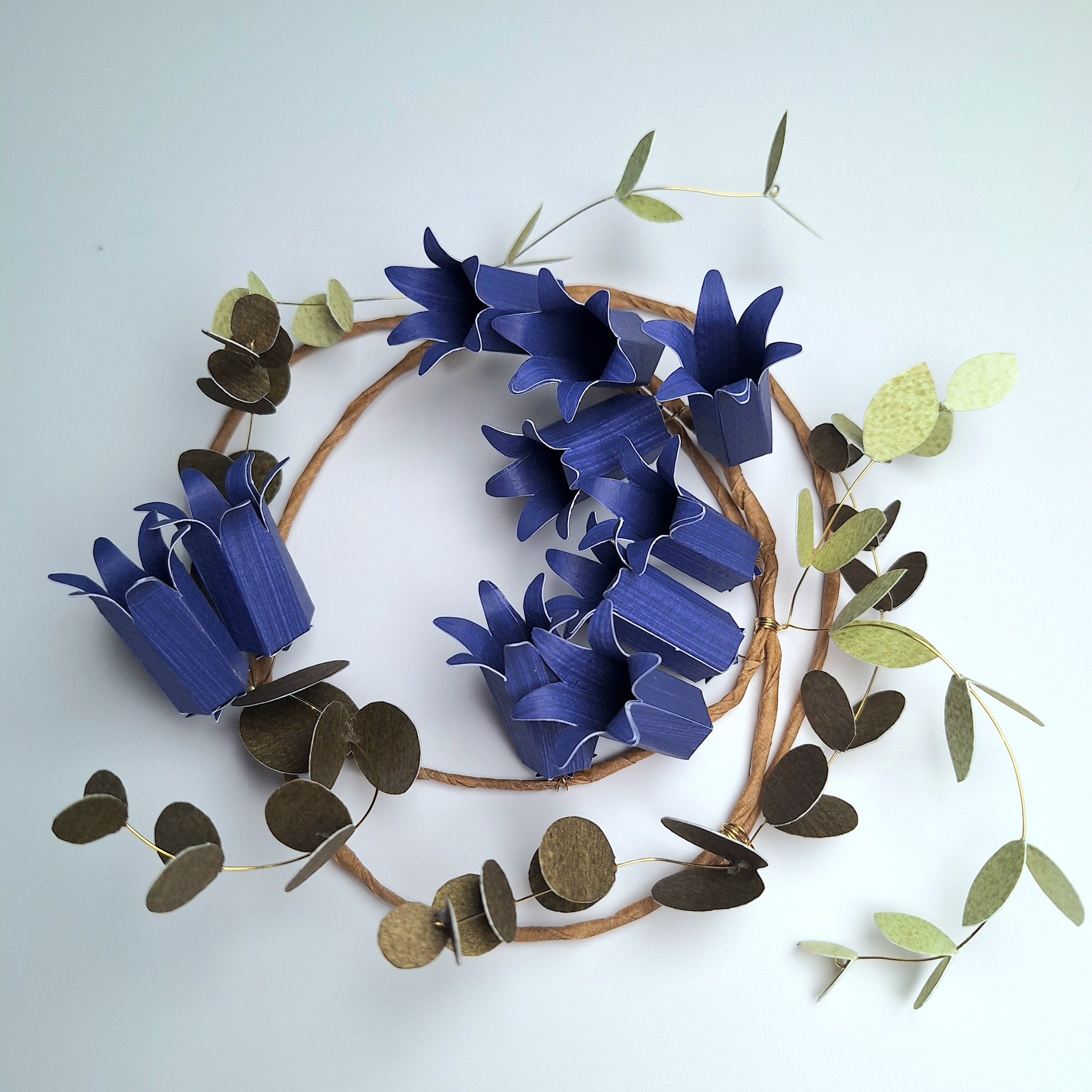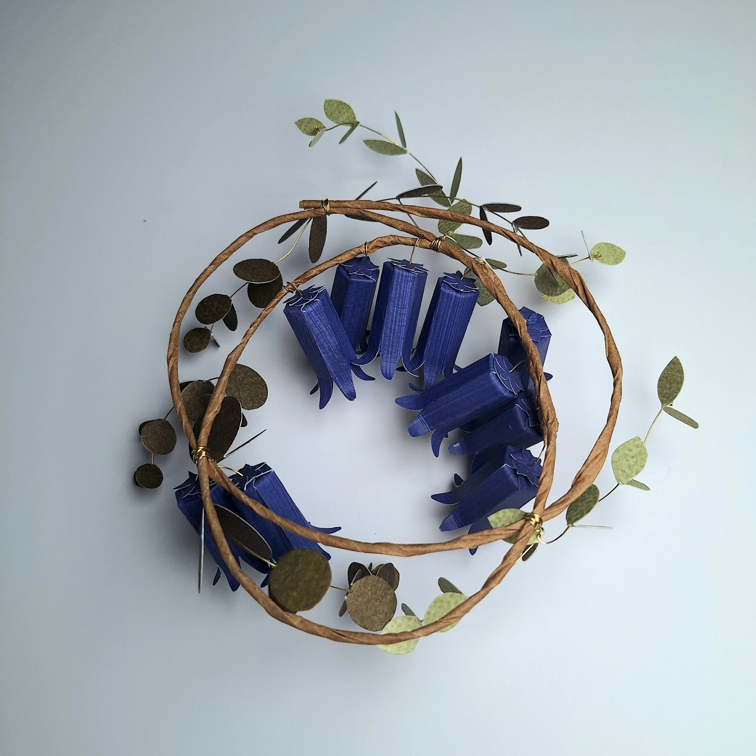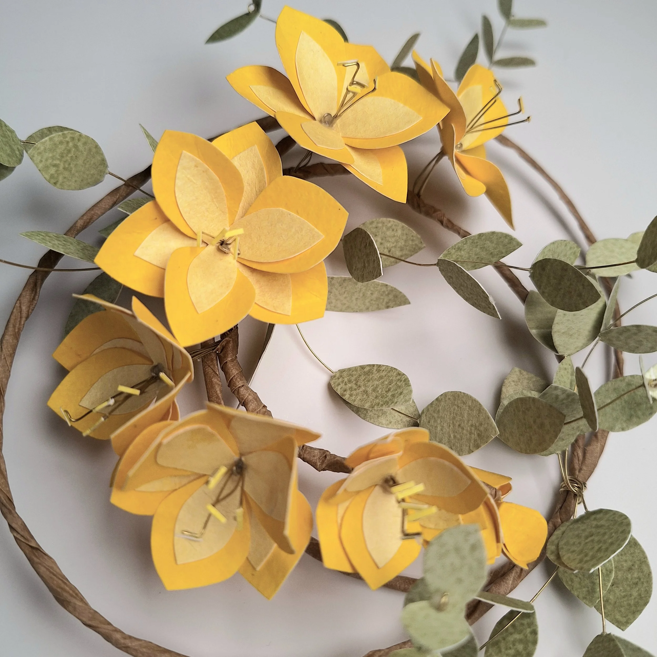 This wreath features a stem of sunshine yellow freesia blooms, ascending in size from bud to fully open flowers.
