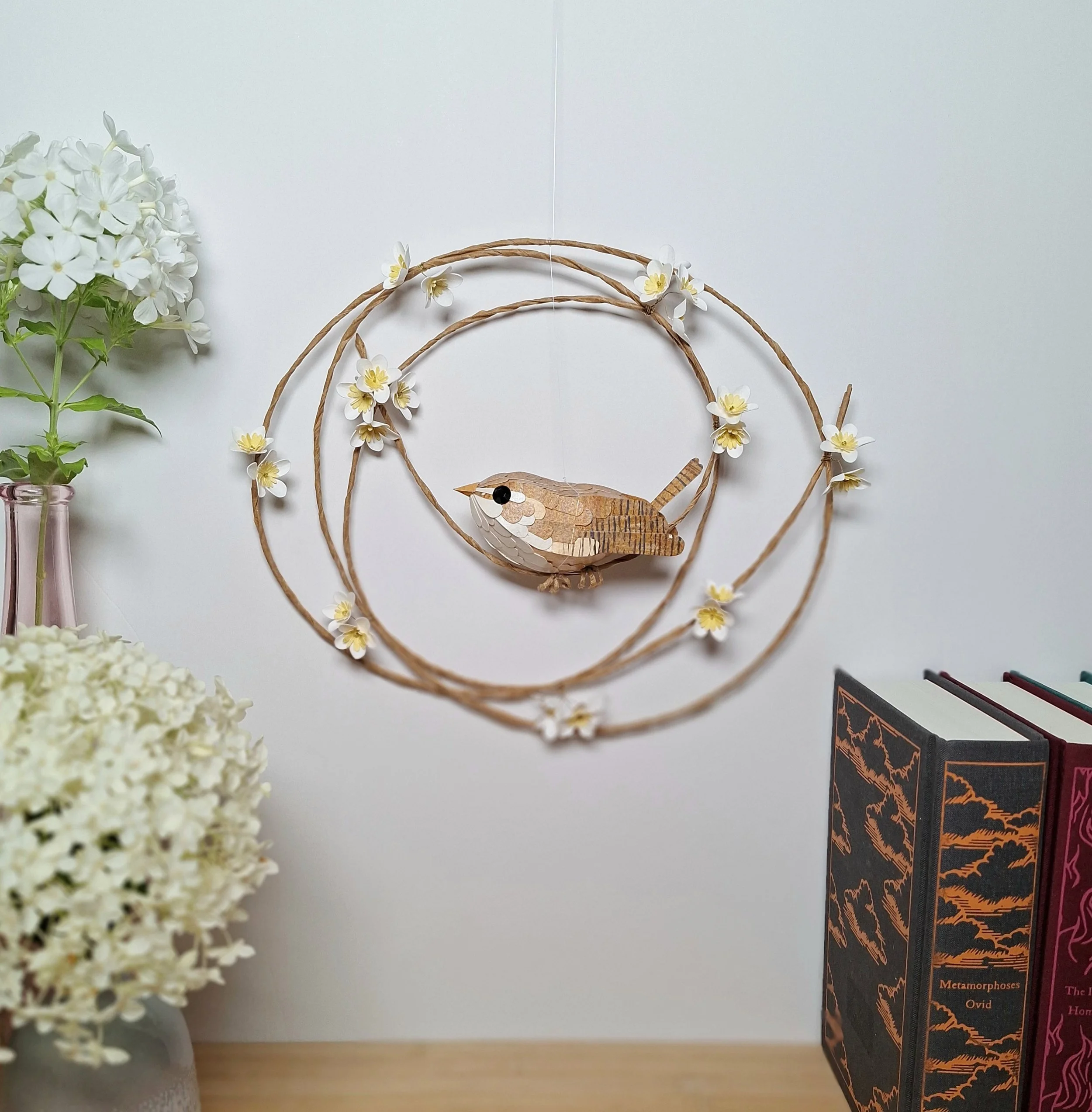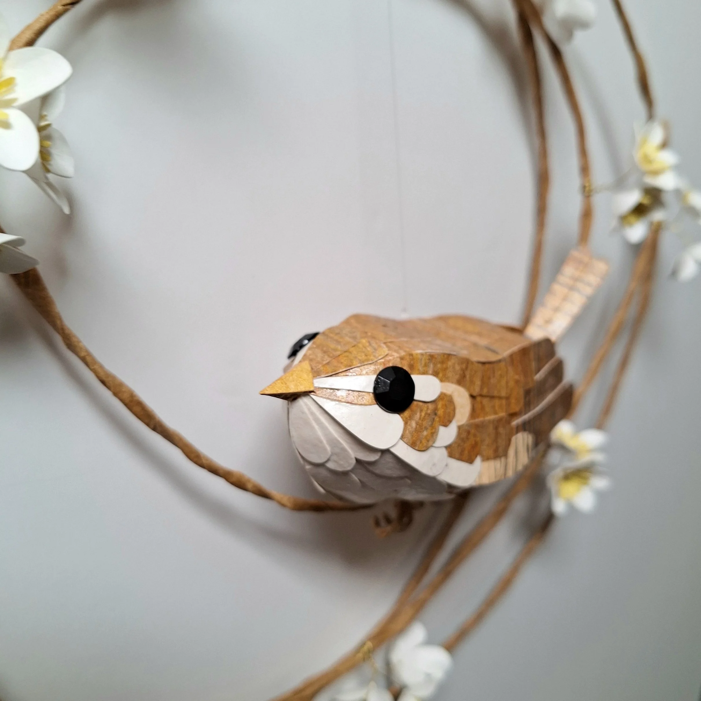 Each bird themed wall sculpture has a hand shaped copper coated steel hook, suspended on invisible fishing line, at a 30 cm drop from the top of the wreath. This hook will hang on a nail tack or picture hook on your wall. The sculptures are robust, but lightweight, so will only require one tack.
