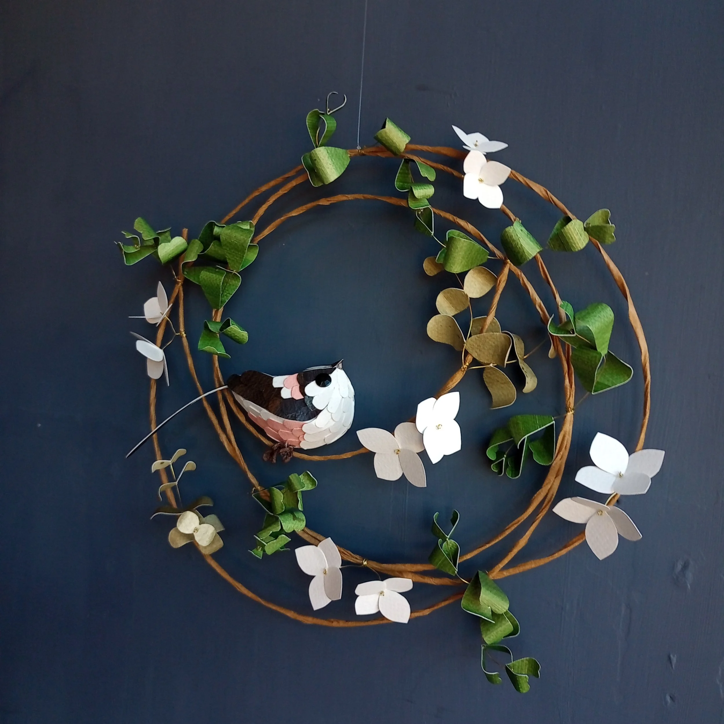 I aim to run as environmentally friendly a business as I can. All sculptures are made with recycled 300 GSM paper. Paints, lacquers and lustres are vegan. My sculptures are wrapped with entirely recyclable packaging, from the paper ribbon to tape. I use acrylic paints and plastic eyeballs and invisible fishing line to hang the wreaths, which I use sparingly to minimise waste.