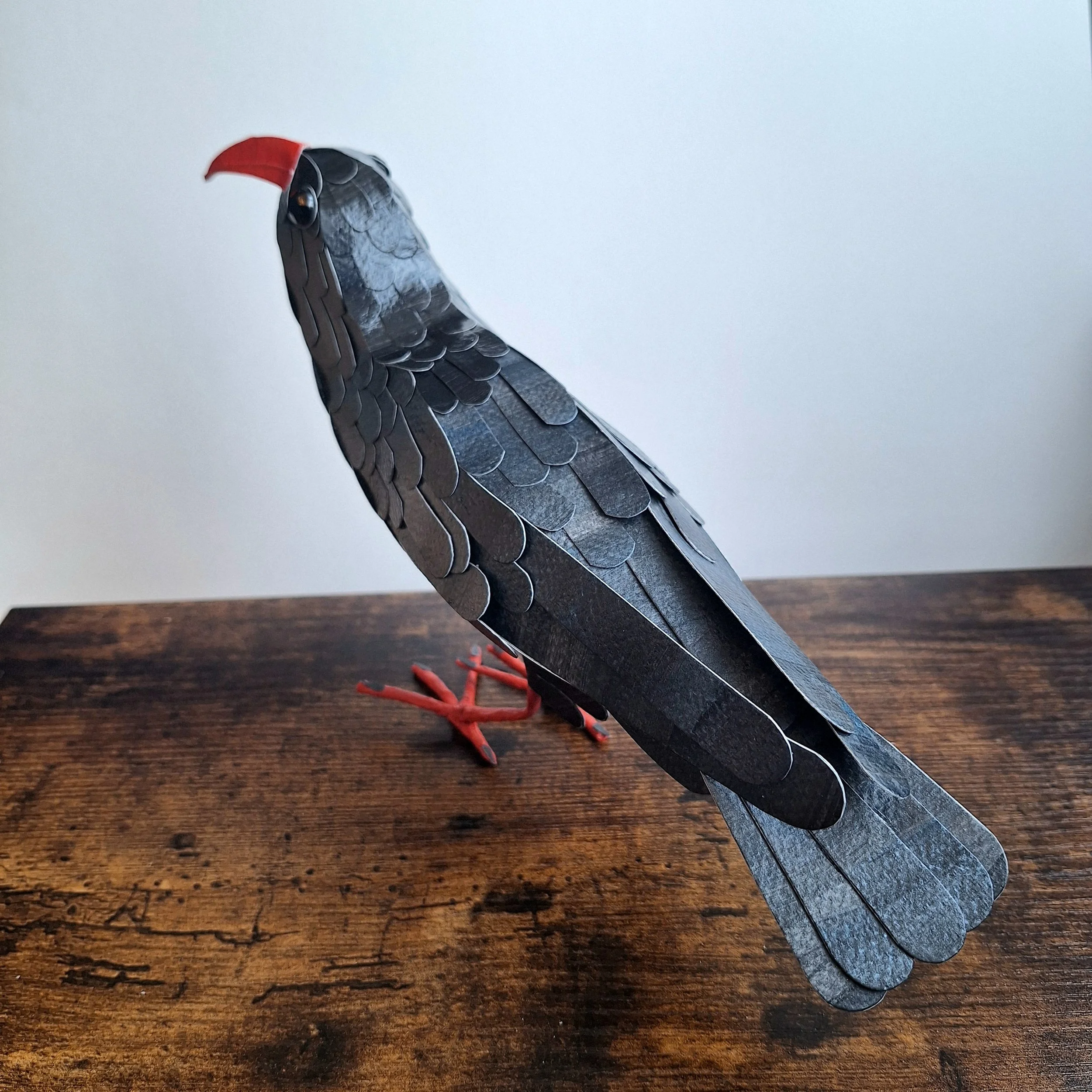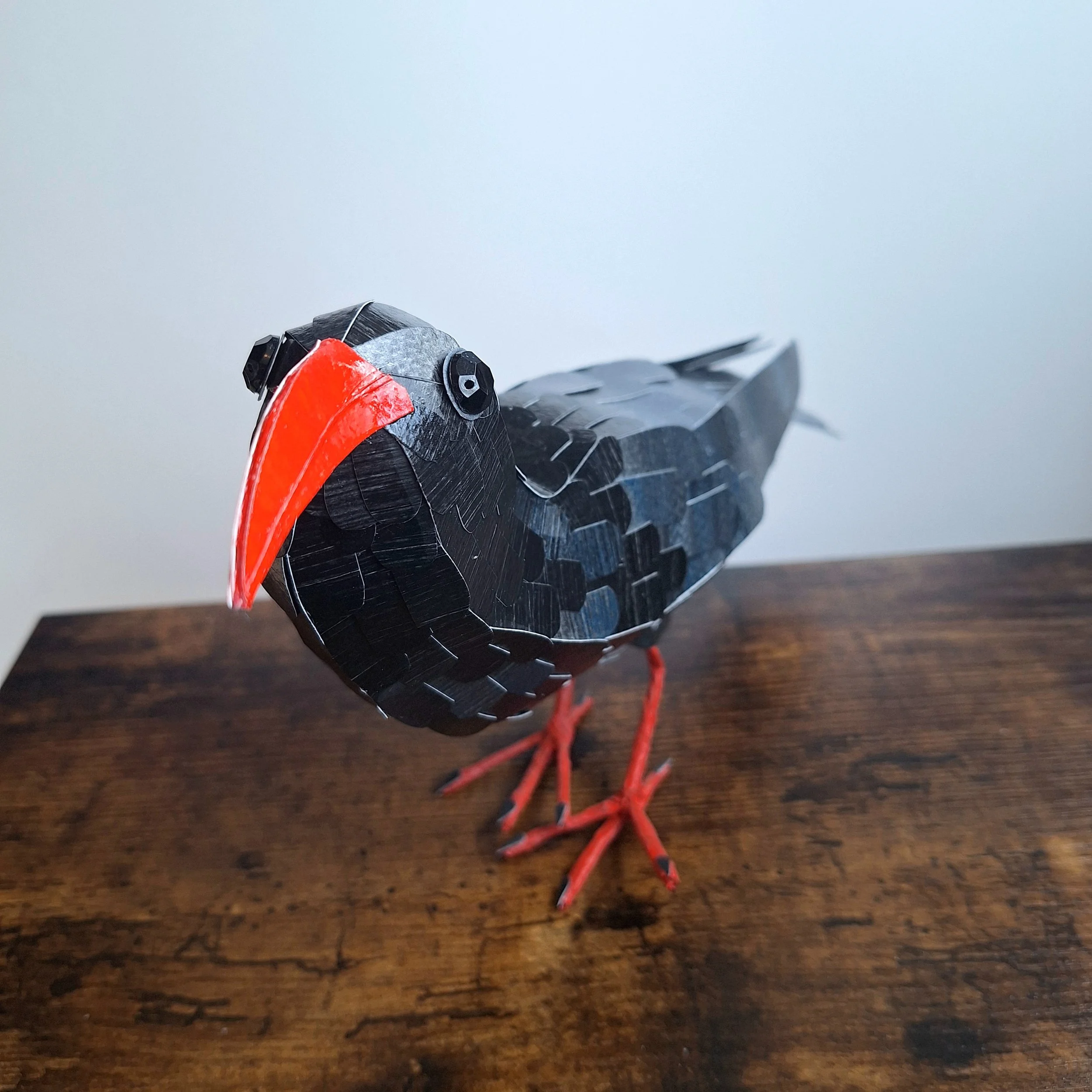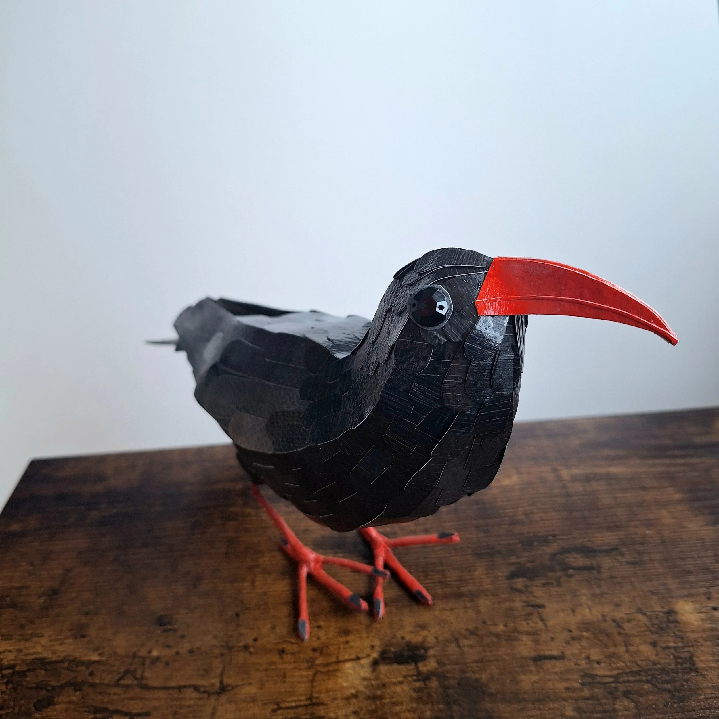 This chough is 30 cm from tail to beak and is 18 cm tall. He has black feathers, with red beak and feet. His wing feathers have a slight metallic indigo blue tone to their black.