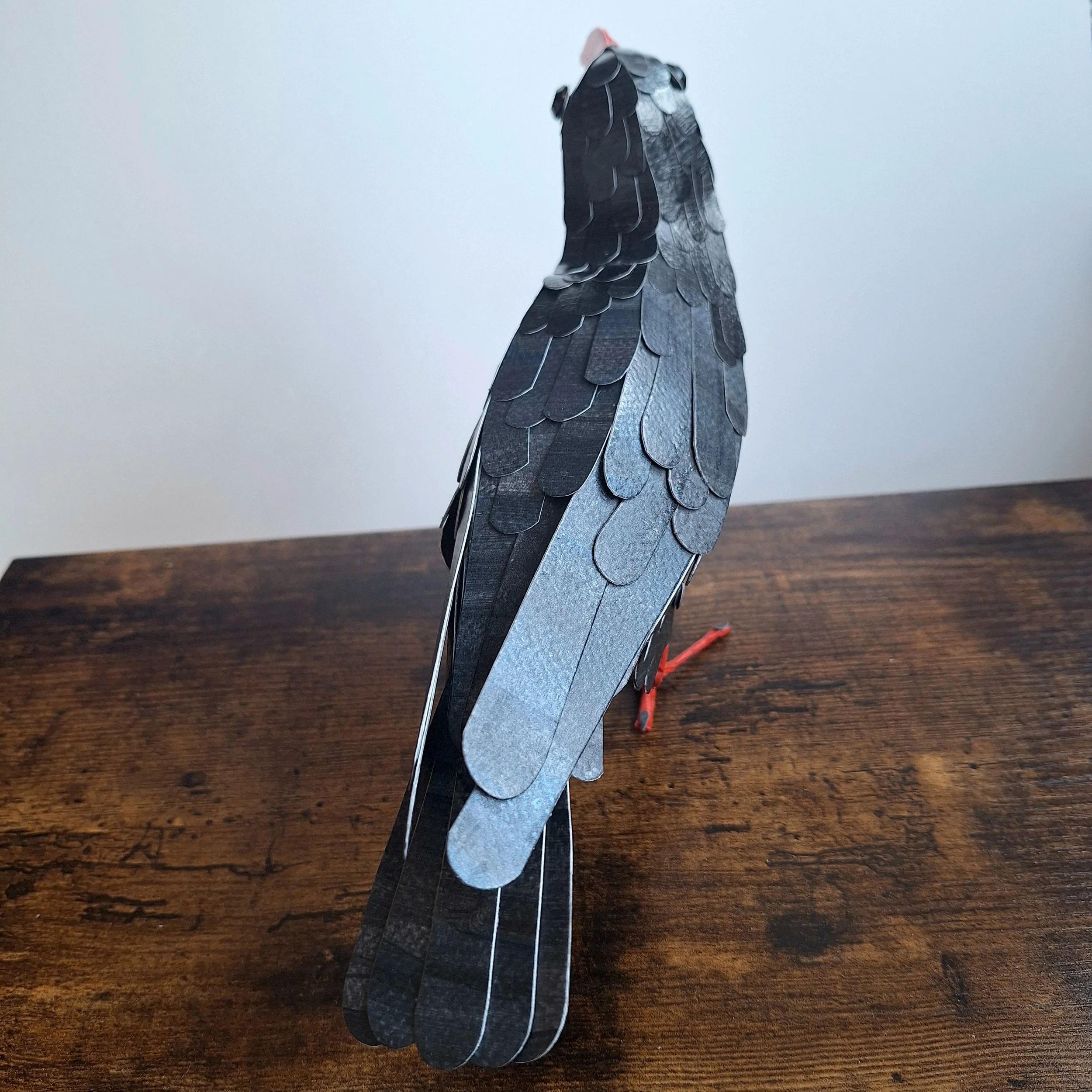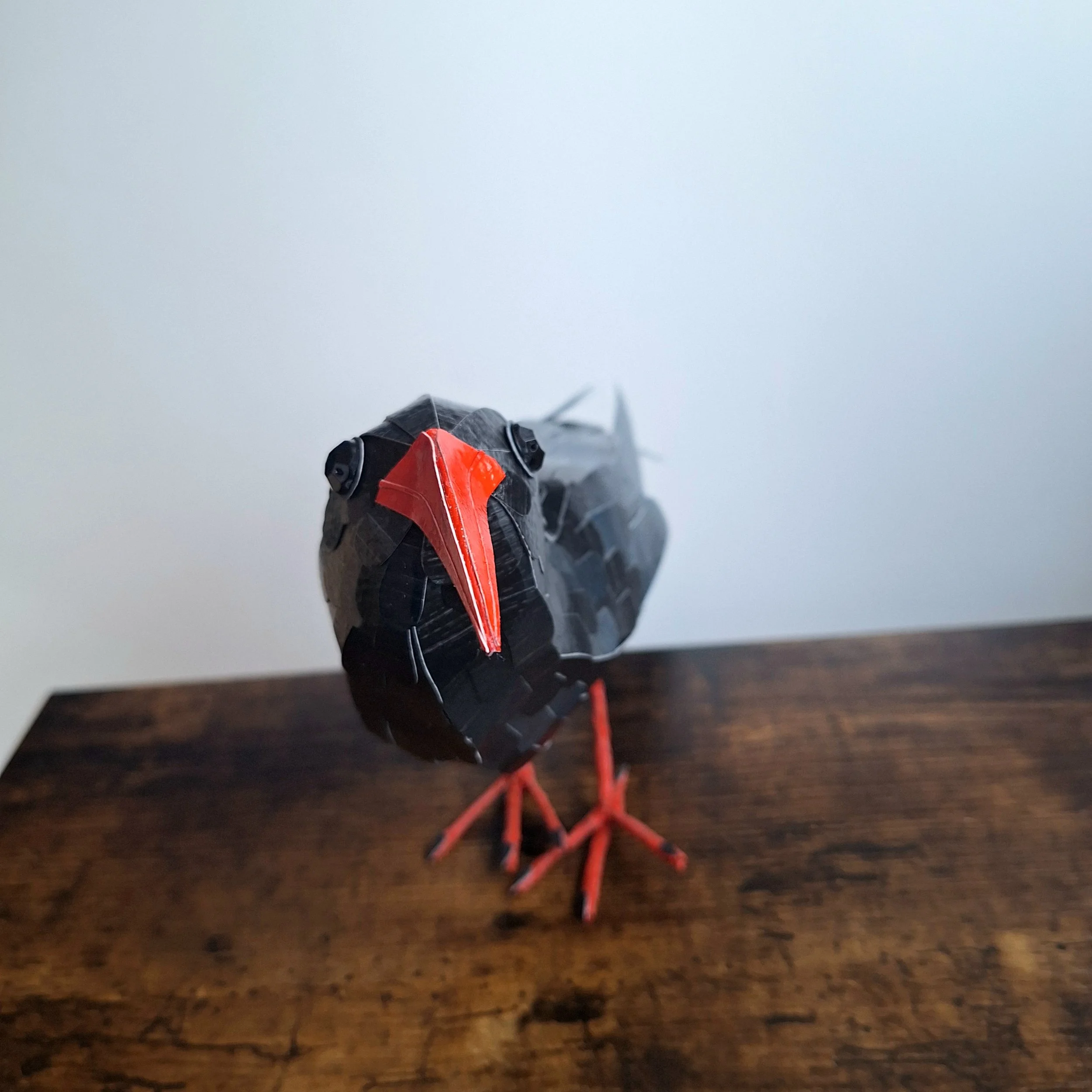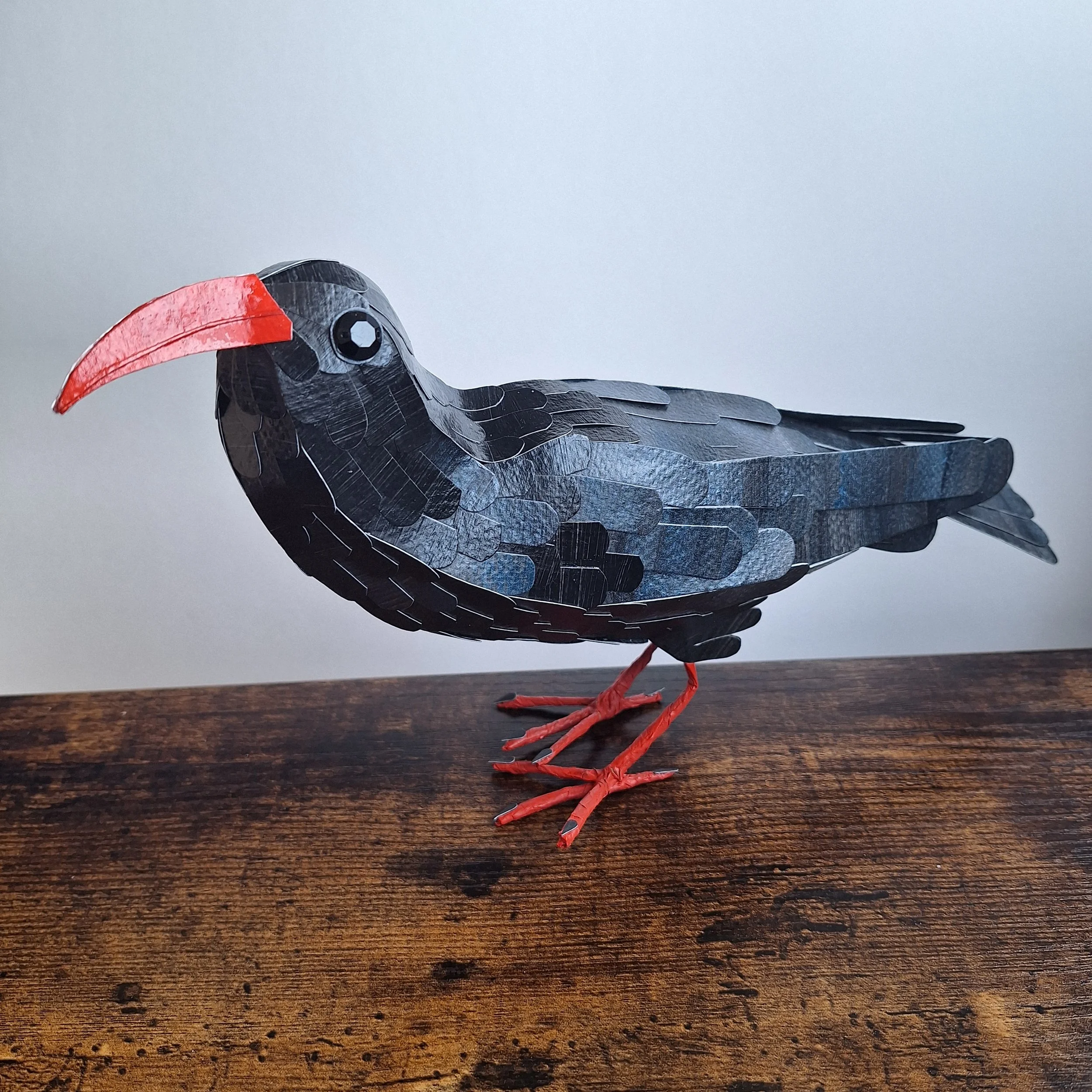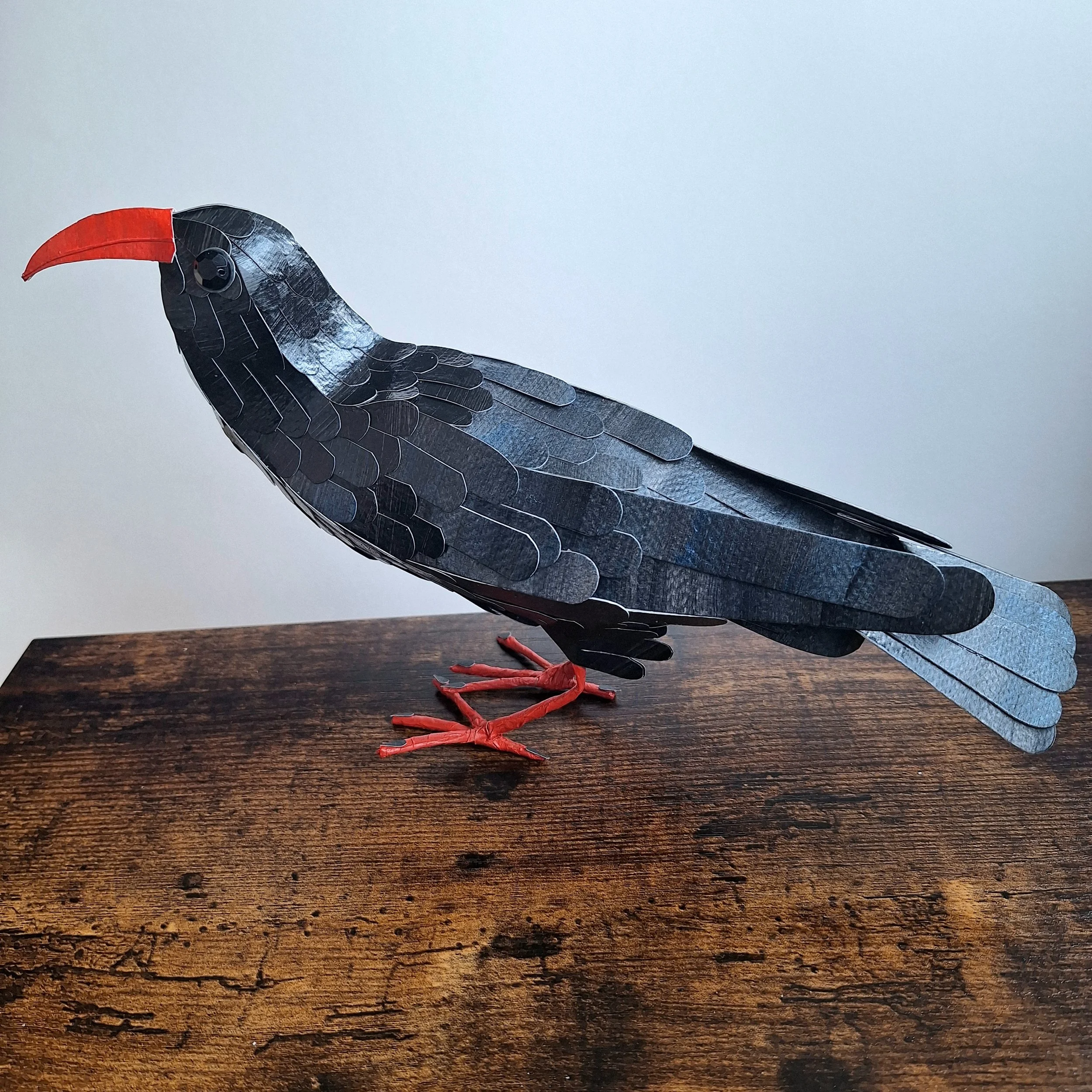This chough is 30 cm from tail to beak and is 18 cm tall. He has black feathers, with red beak and feet. His wing feathers have a slight metallic indigo blue tone to their black.