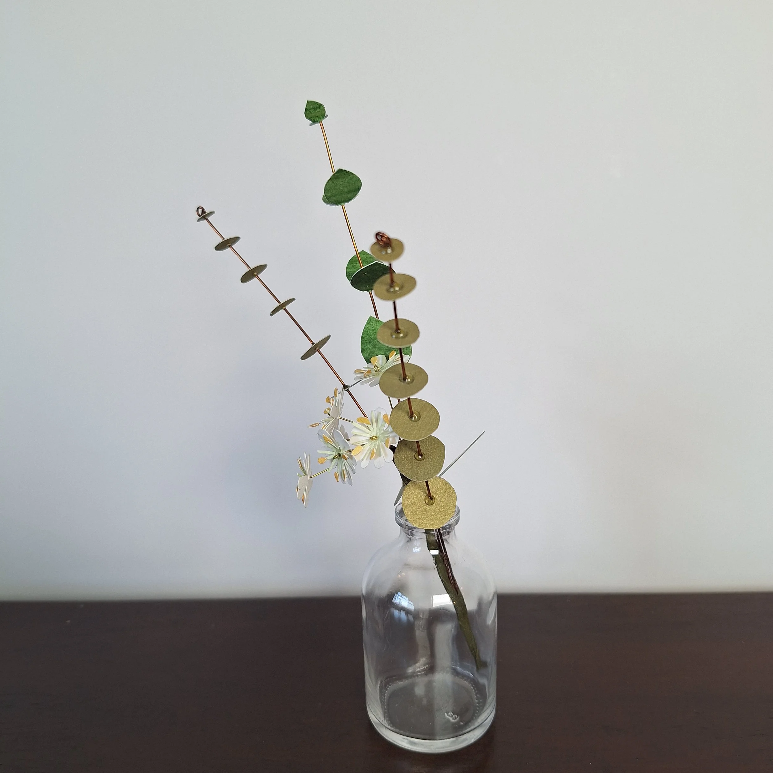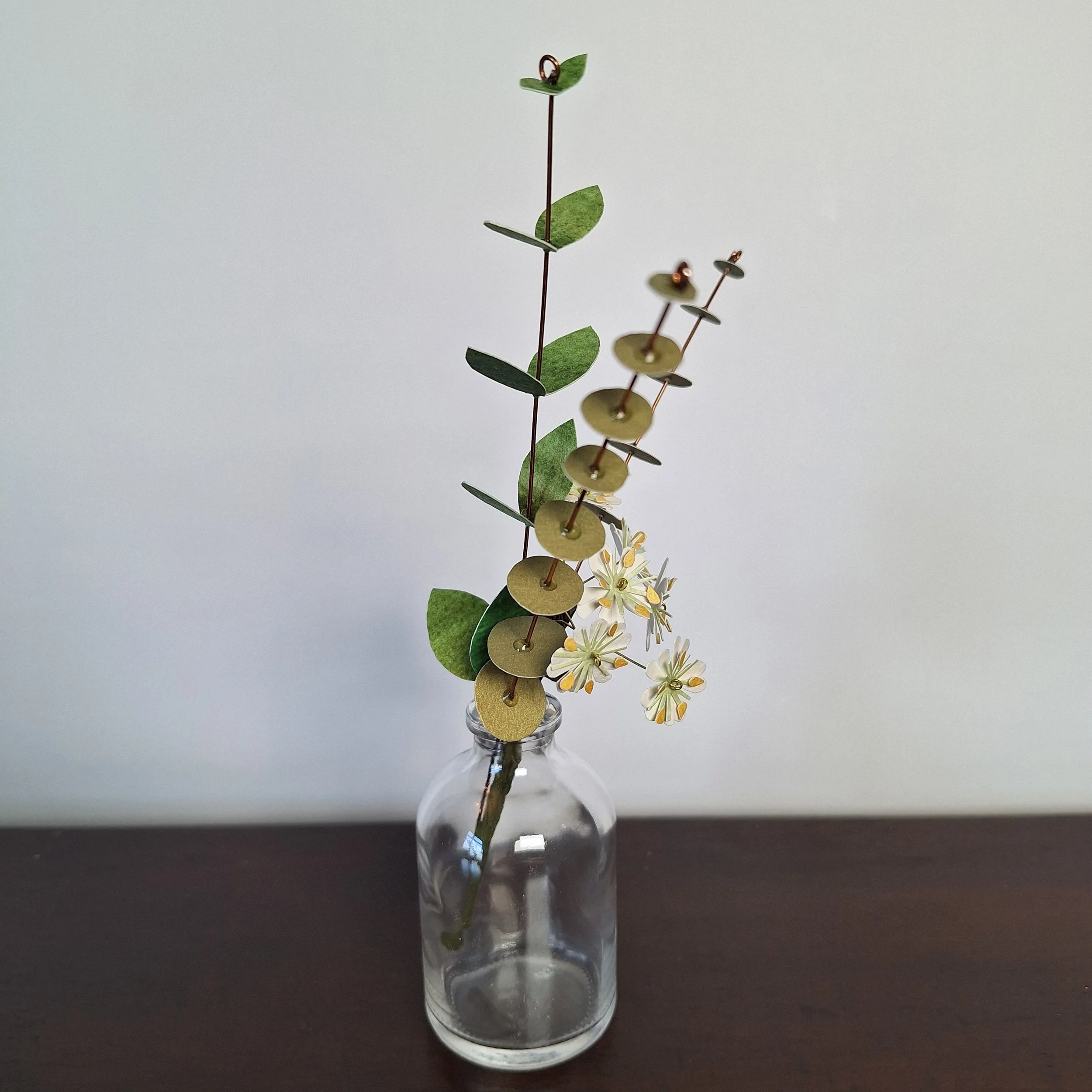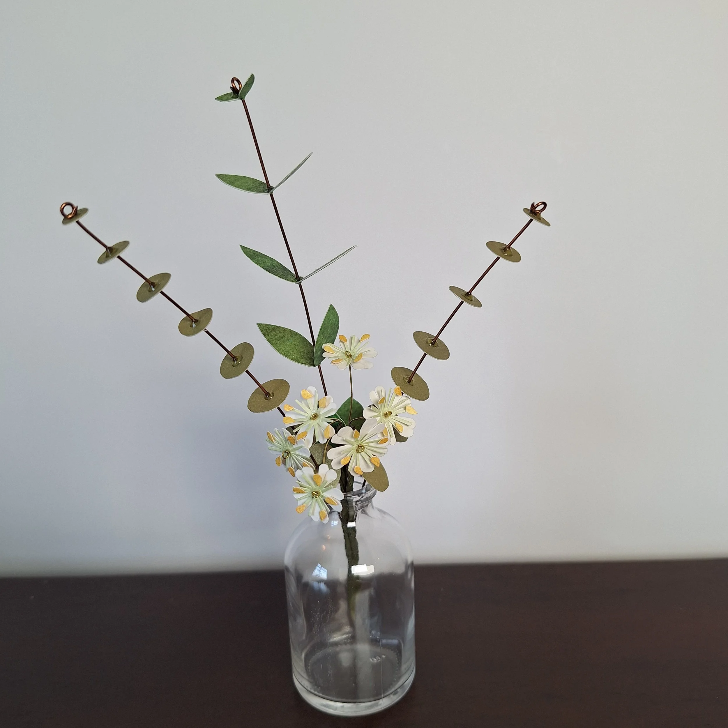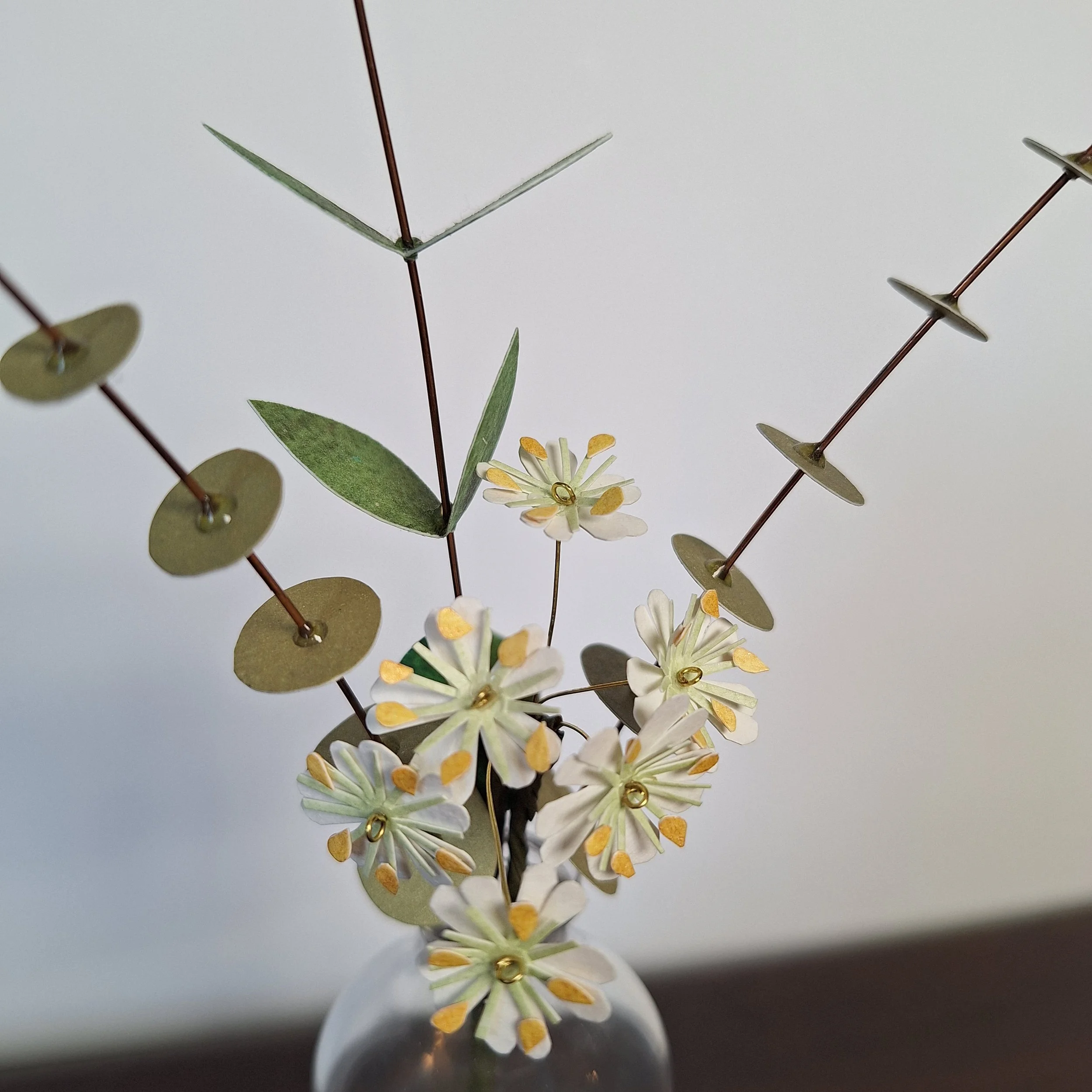 This stitchwort mini bouquet is part of my wildflower collection. A cluster of six stitchwort blooms sit among three leafy stems. The lowers are white, with green filaments and yellow stamens.