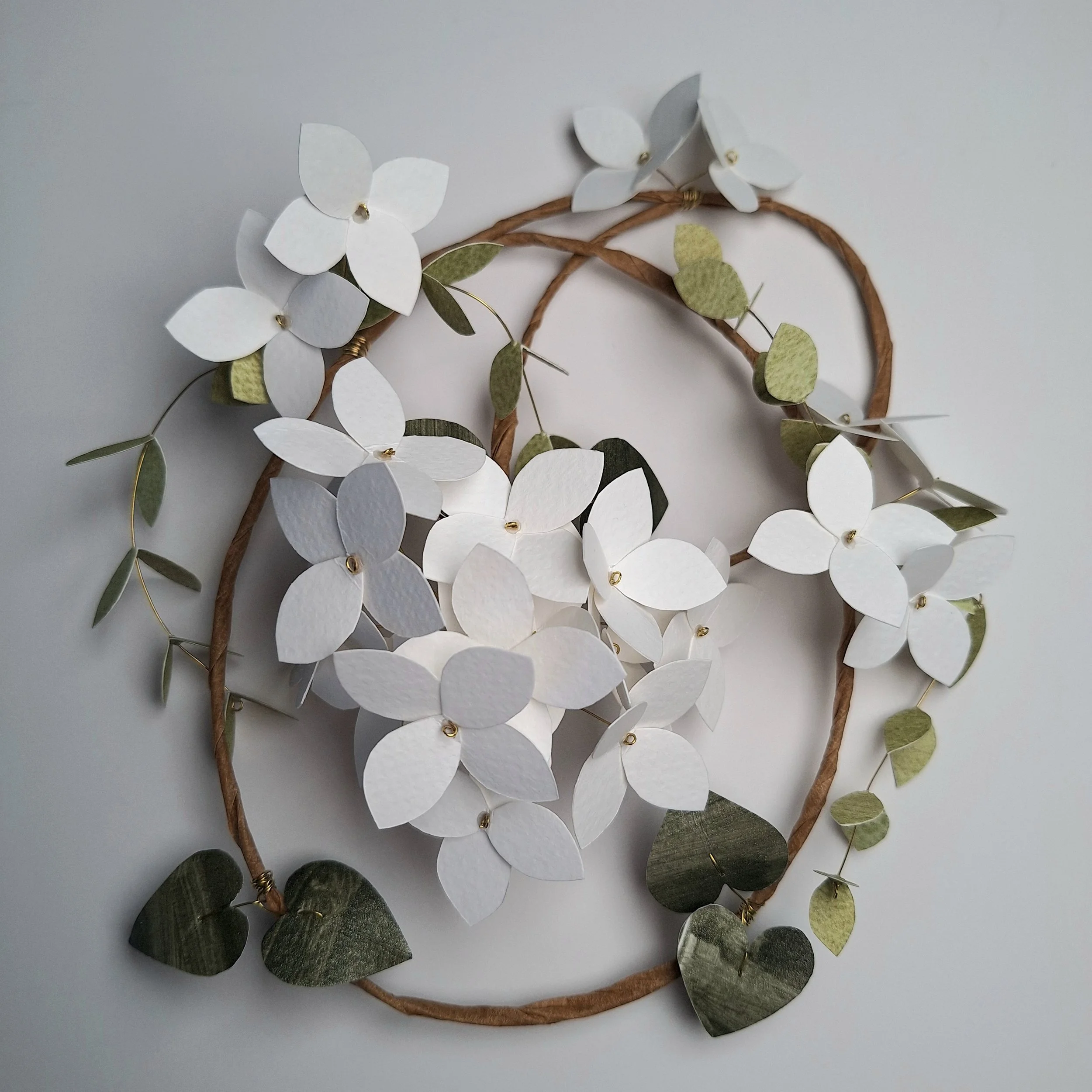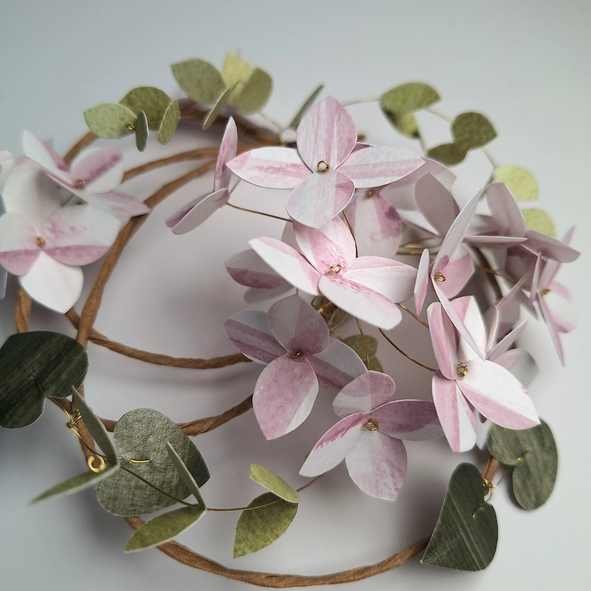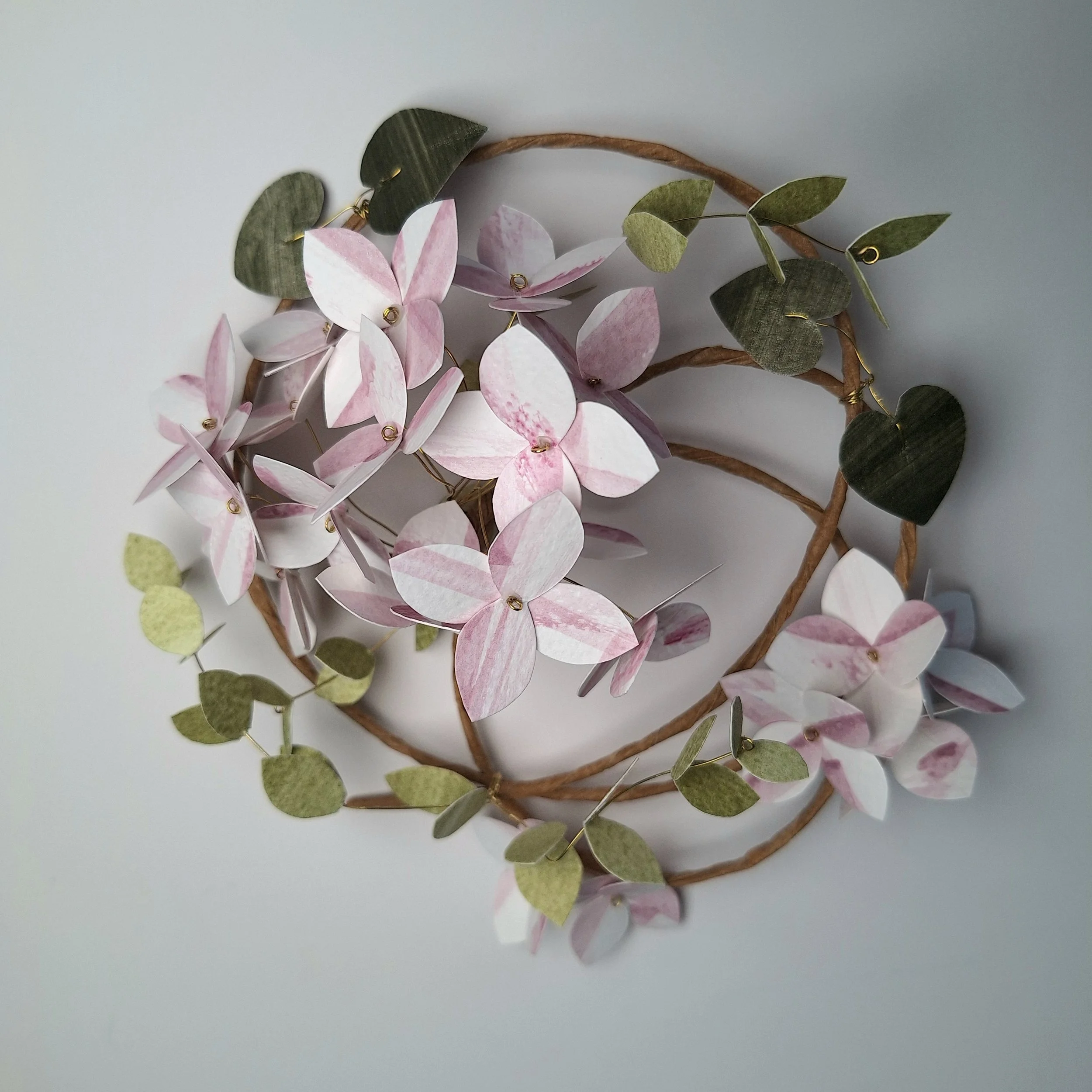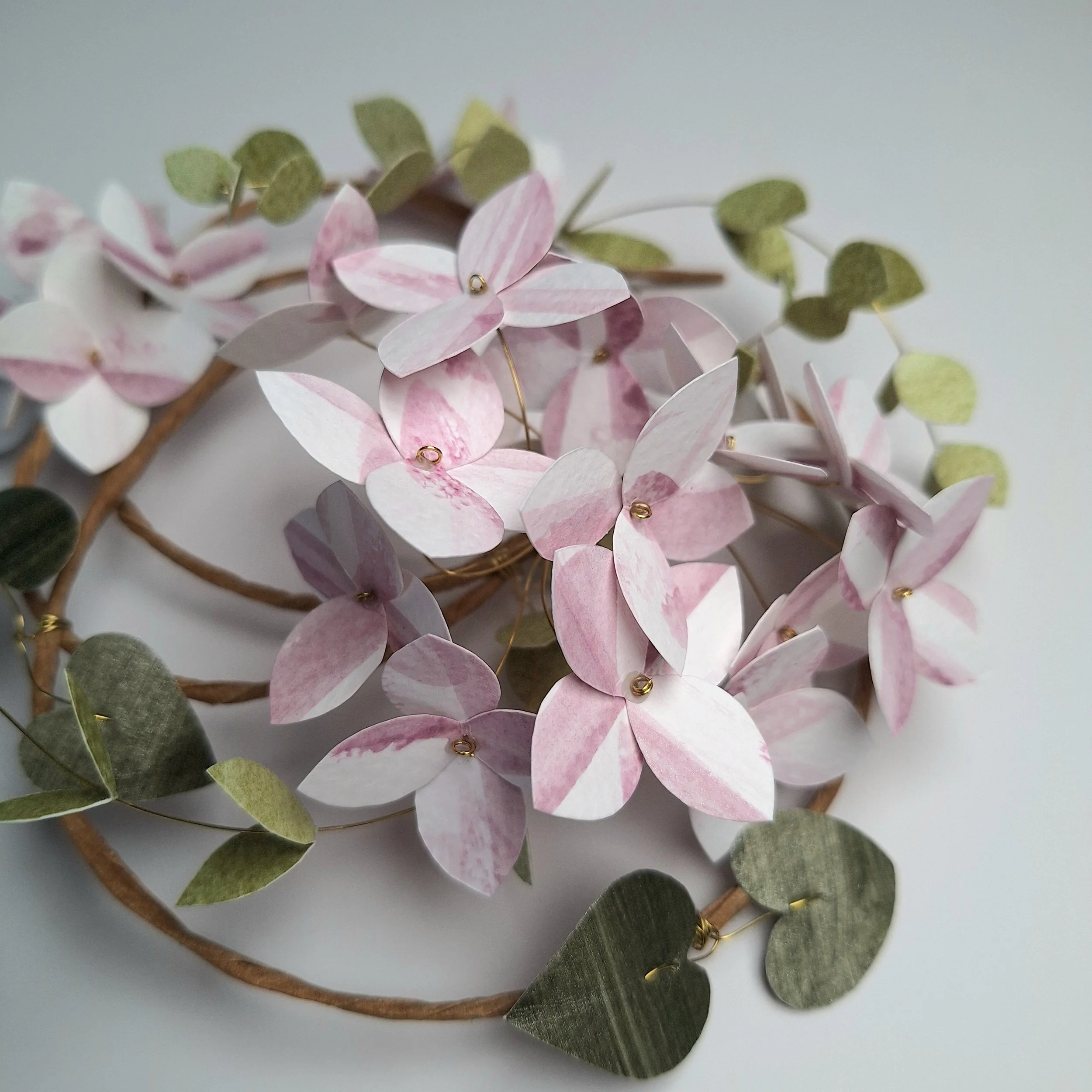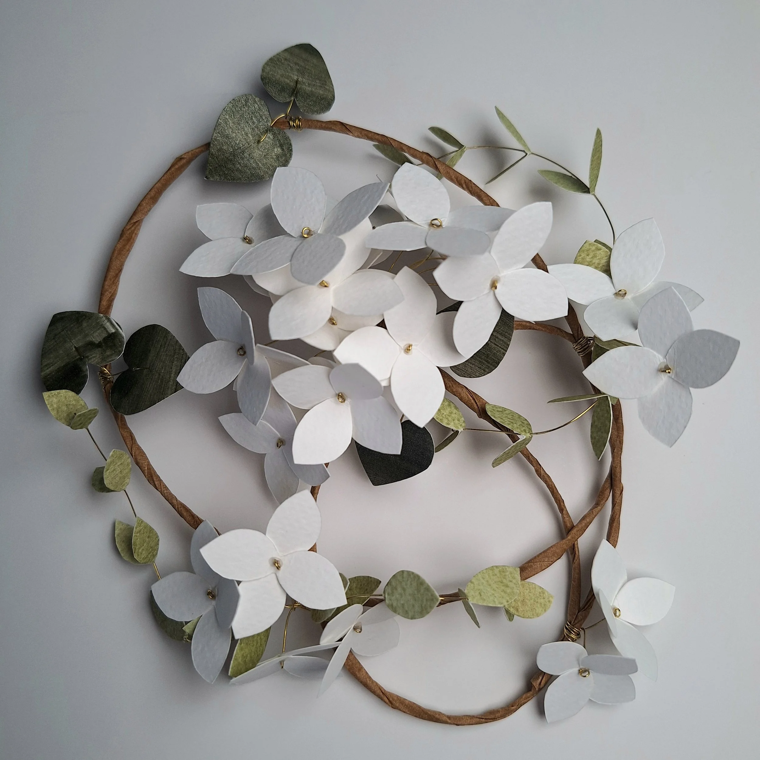The floral wreath has no hanging hook, so you can place it however you’d like to, hanging from its wire hoop, onto a hook or nail tack on your wall. The main frame of the floral wreath is made with a rather unwieldy steel wire, which holds its shape very well. The stems of the hydrangea blooms and the leafy stems are made with brass wire, which is strong enough to handle, but is pliable if you fancy having a particular leaf point in one direction.