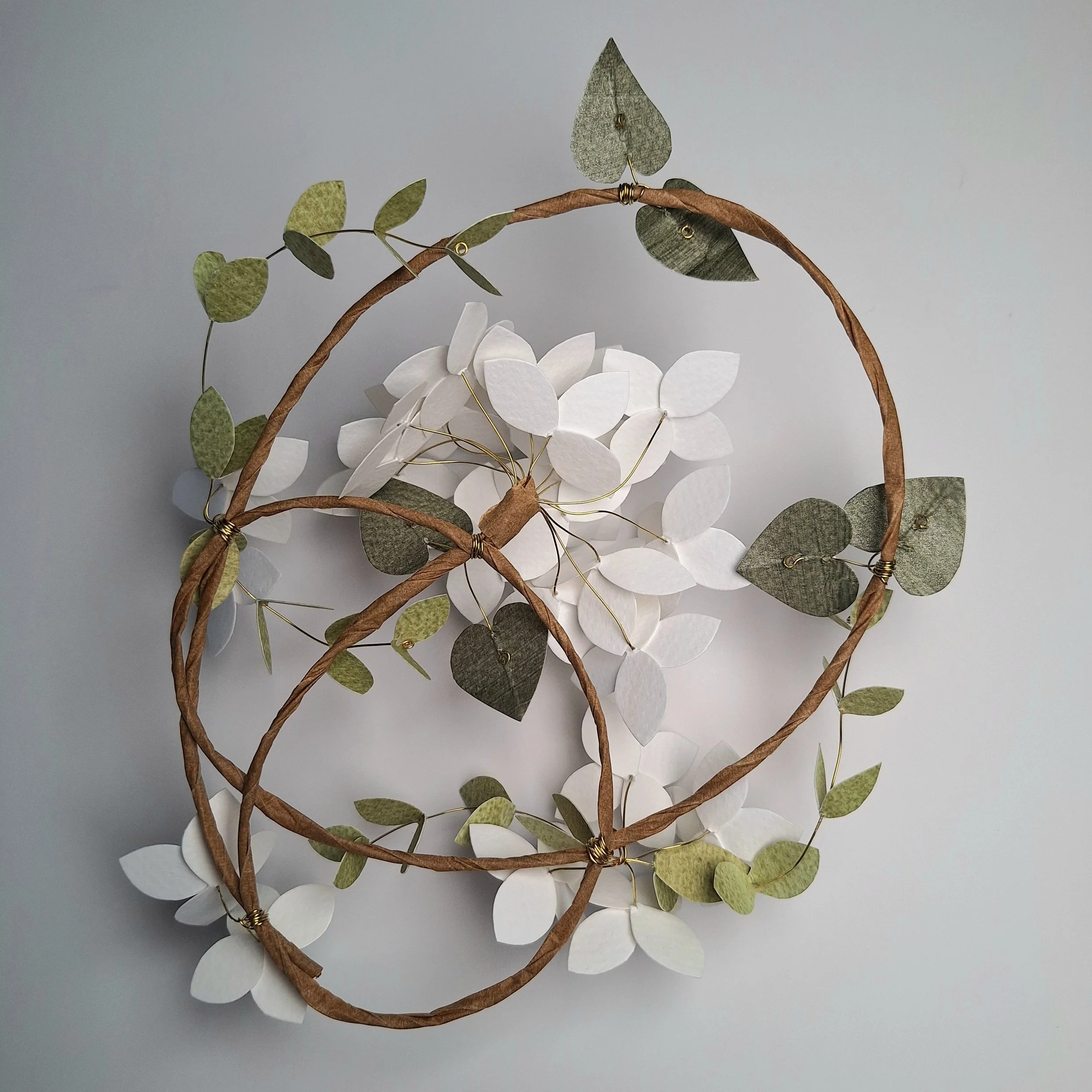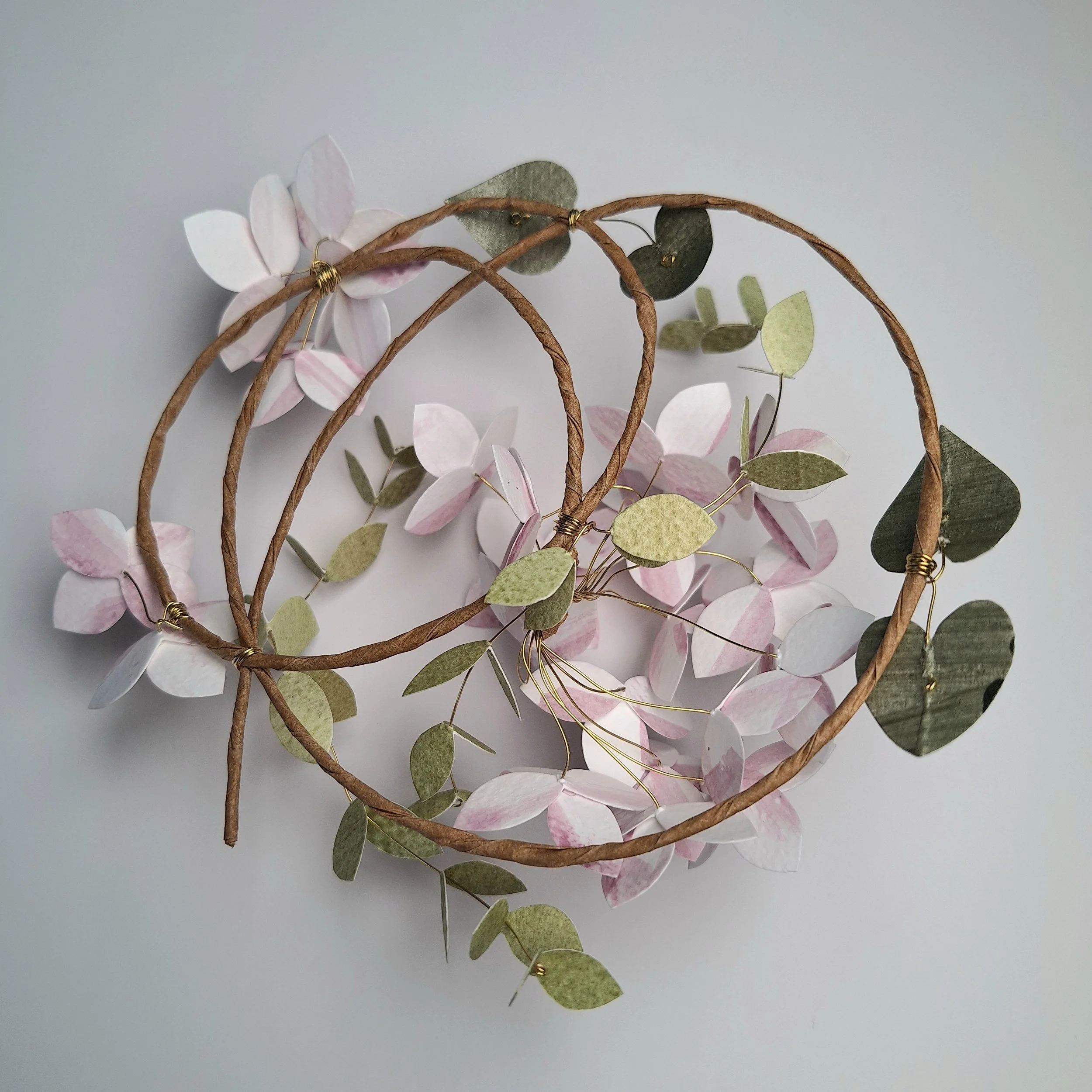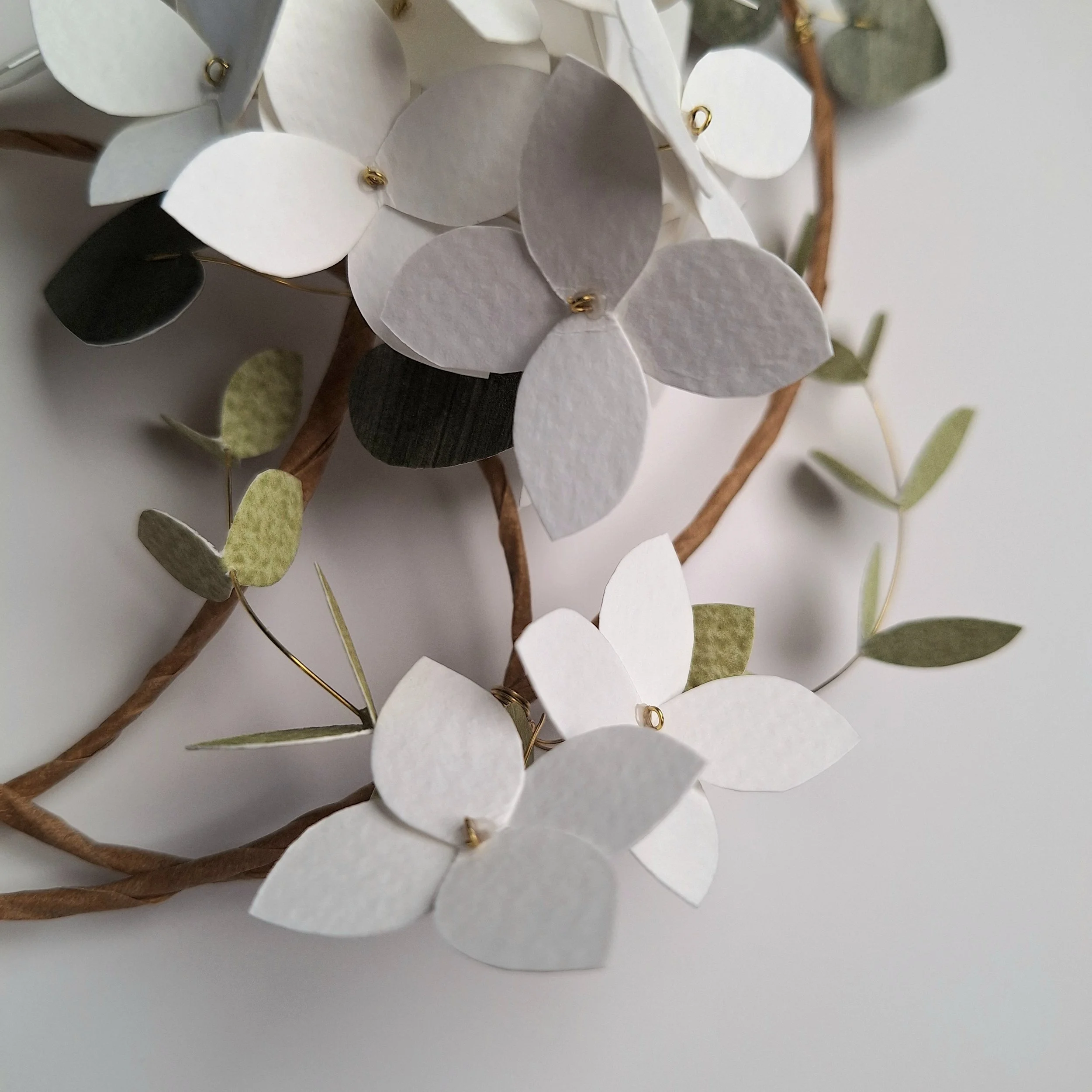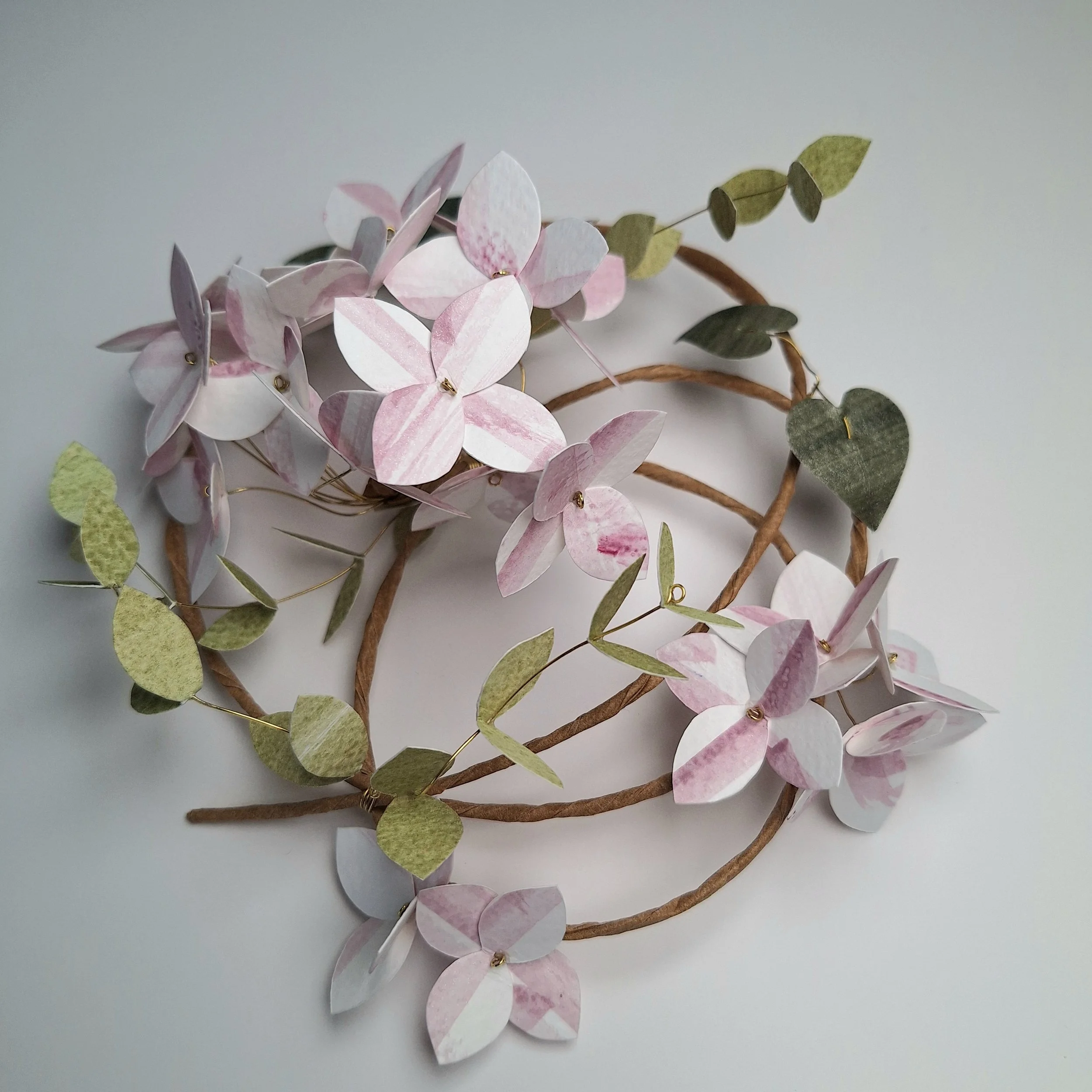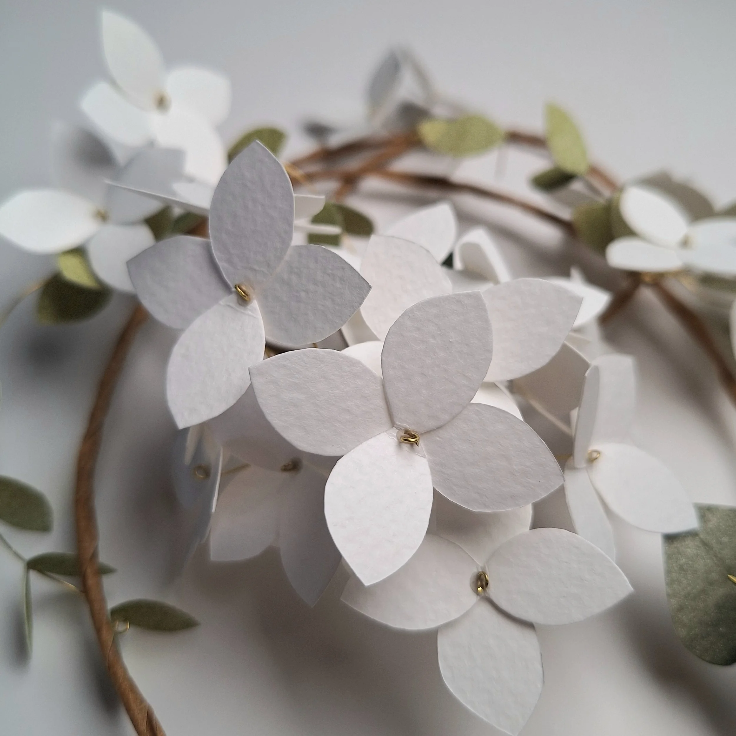 The floral wreath has no hanging hook, so you can place it however you’d like to, hanging from its wire hoop, onto a hook or nail tack on your wall. The main frame of the floral wreath is made with a rather unwieldy steel wire, which holds its shape very well. The stems of the hydrangea blooms and the leafy stems are made with brass wire, which is strong enough to handle, but is pliable if you fancy having a particular leaf point in one direction.