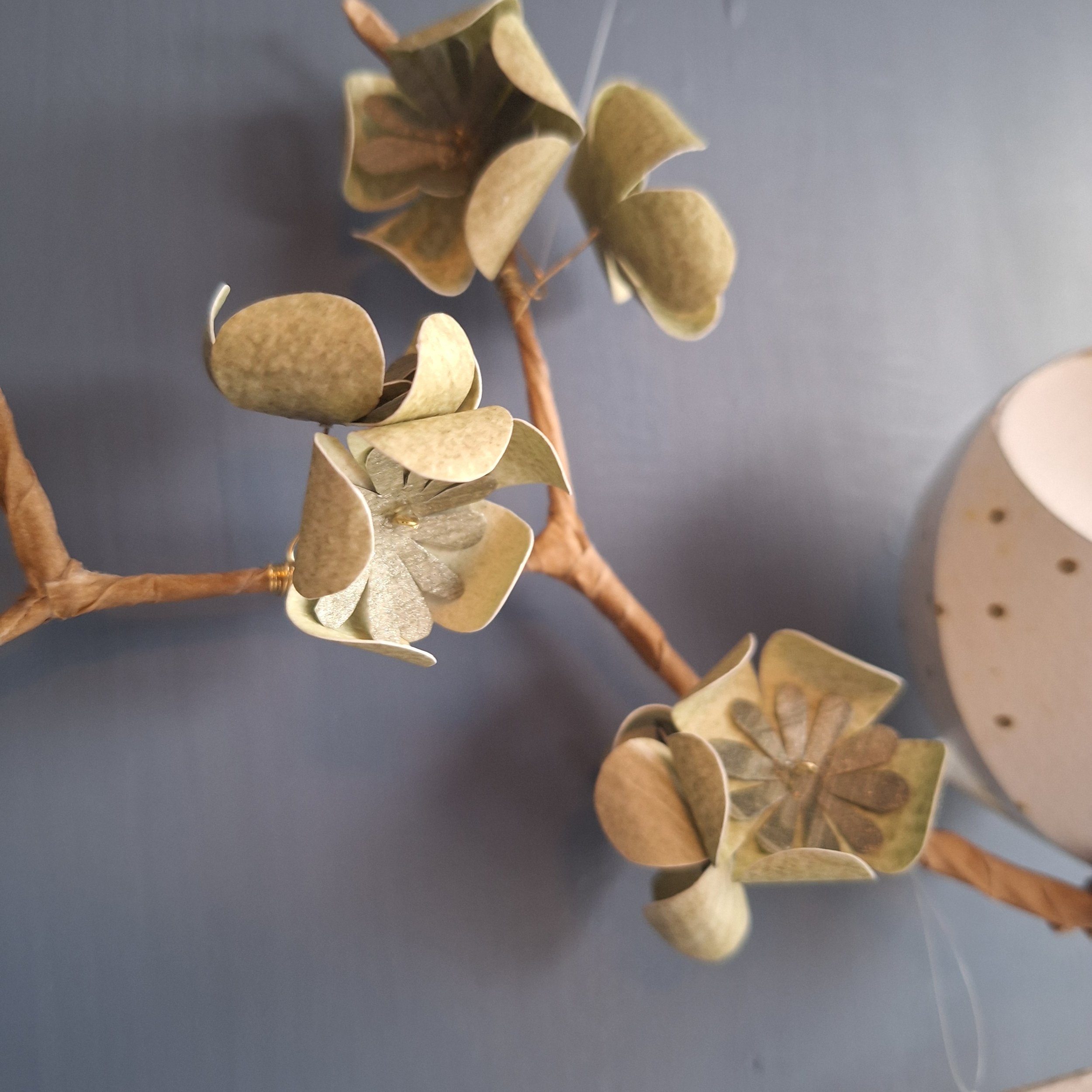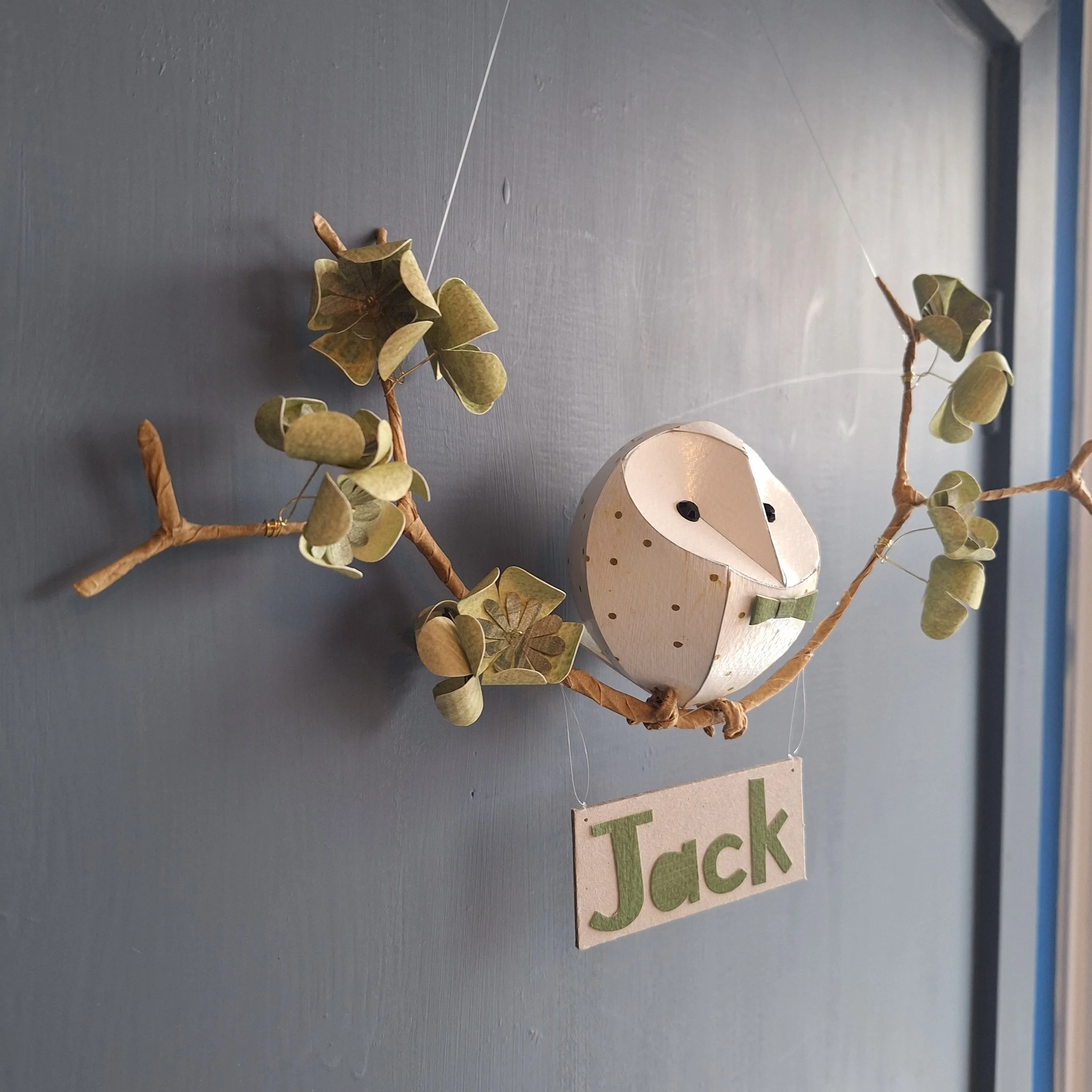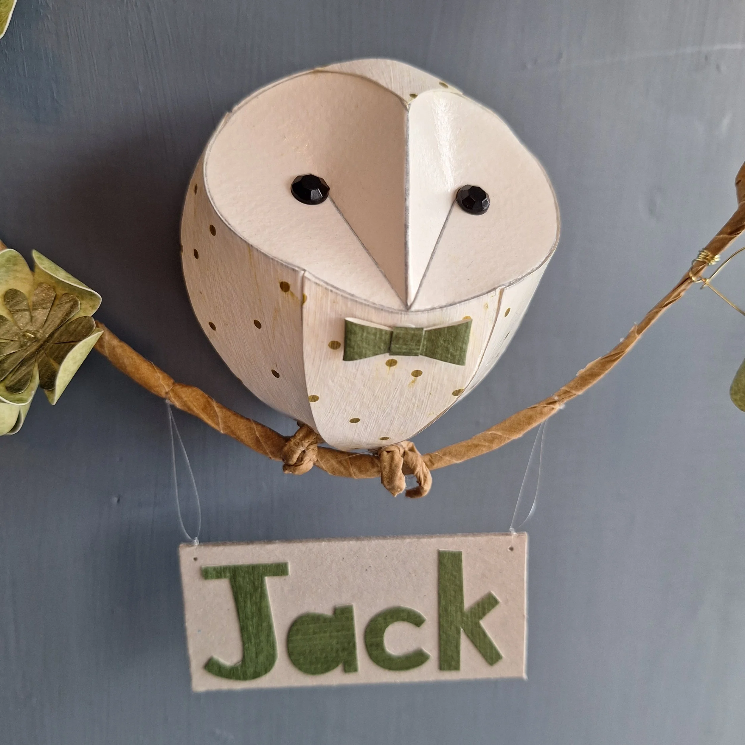 Baby barn owl on a branch with green flowers, bow tie and name tag.