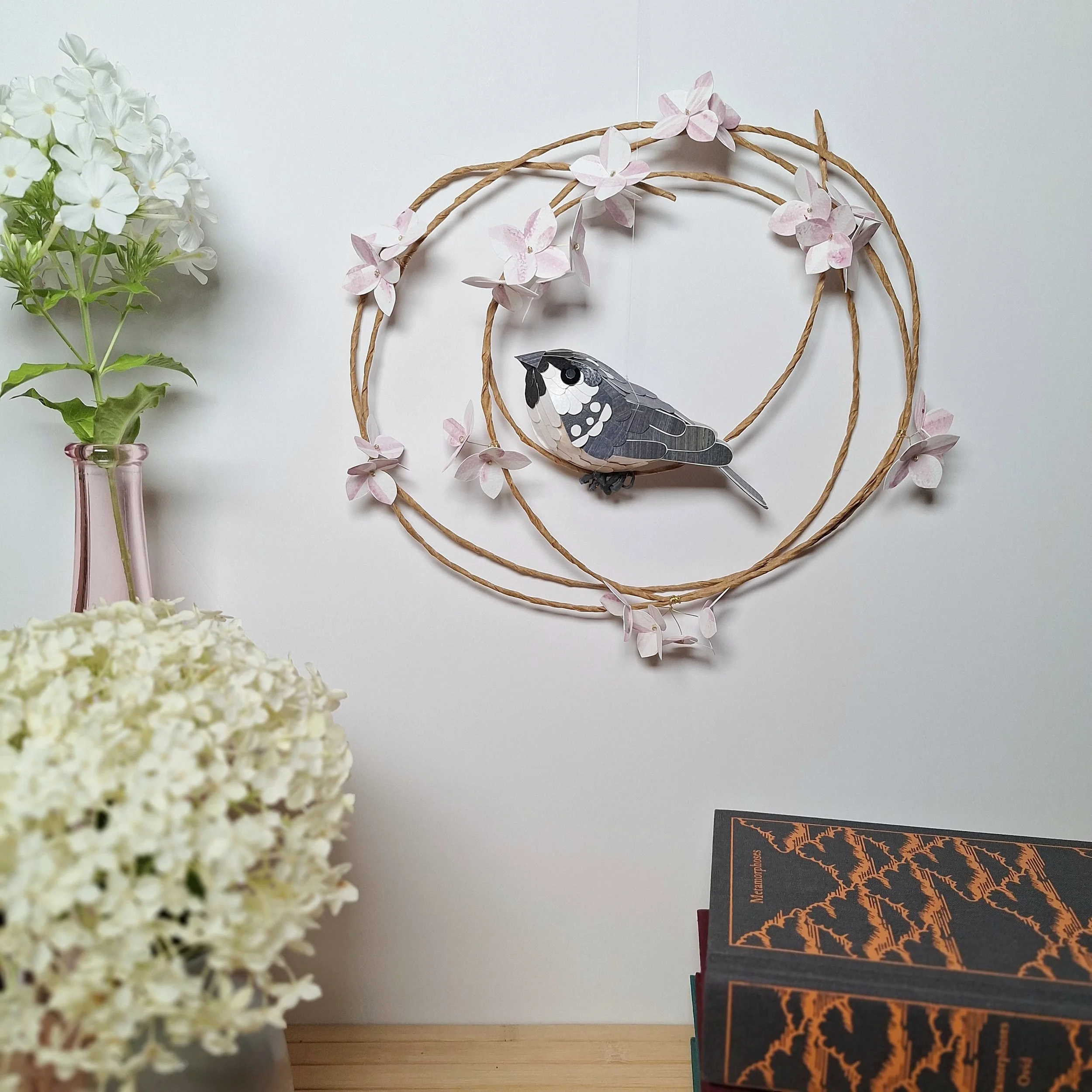 Different flower colours and species can be added or swapped on bird wreaths quite easily, and orders for particular flower species usually only take about a week to make for you. Brand new designs can take up to a month to create for you.